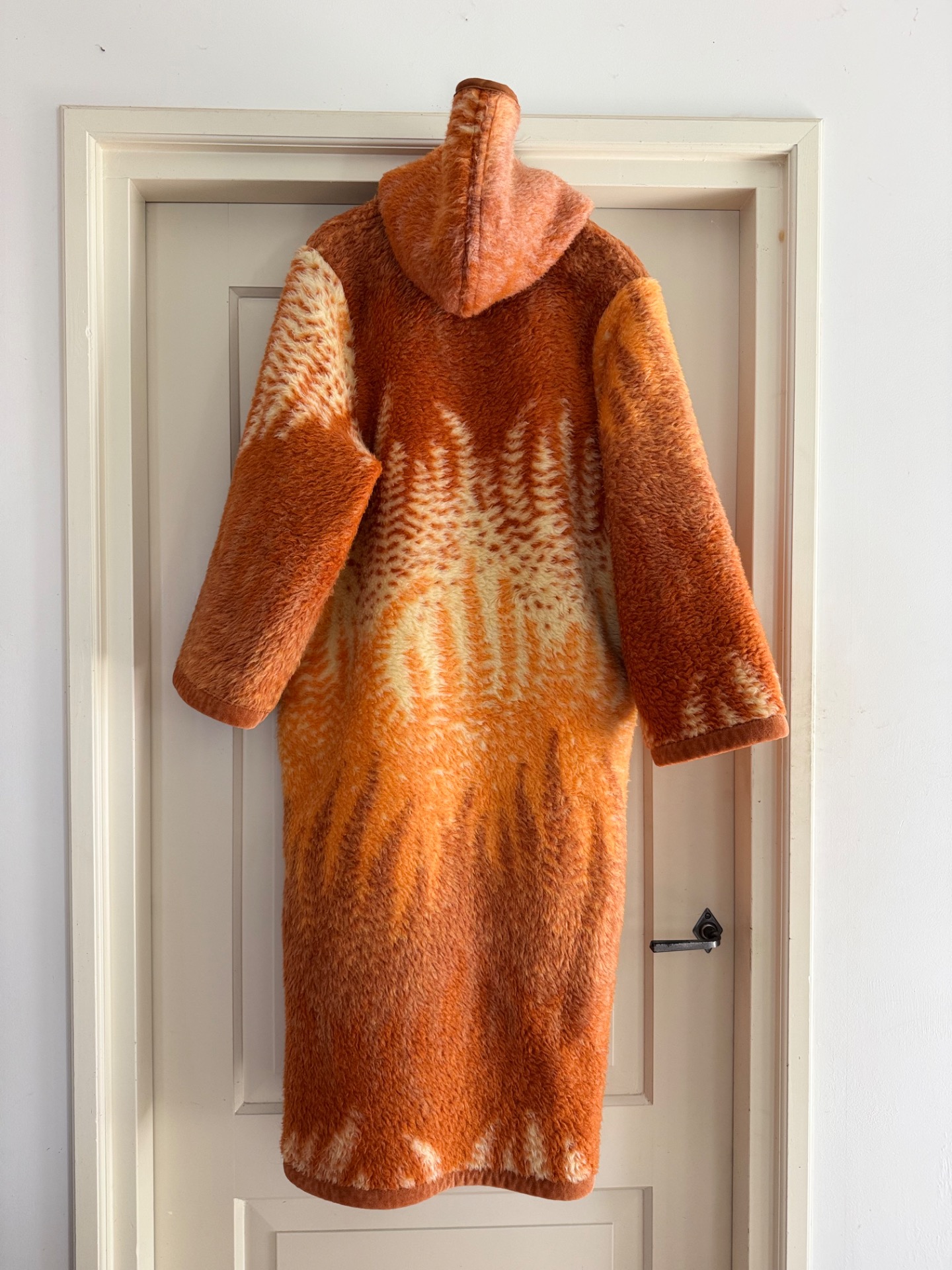 This long coat with hoody will be a gem in its colorscheme. The coat is soft, with a beautiful pattern all over. You can wear it on both sides, there will be contrast piping to add a bit of extra spice.