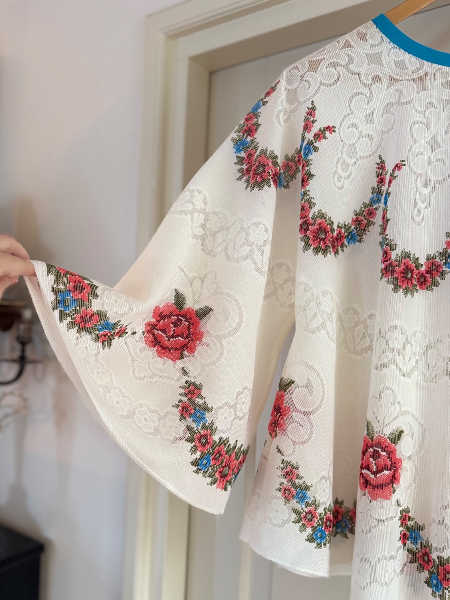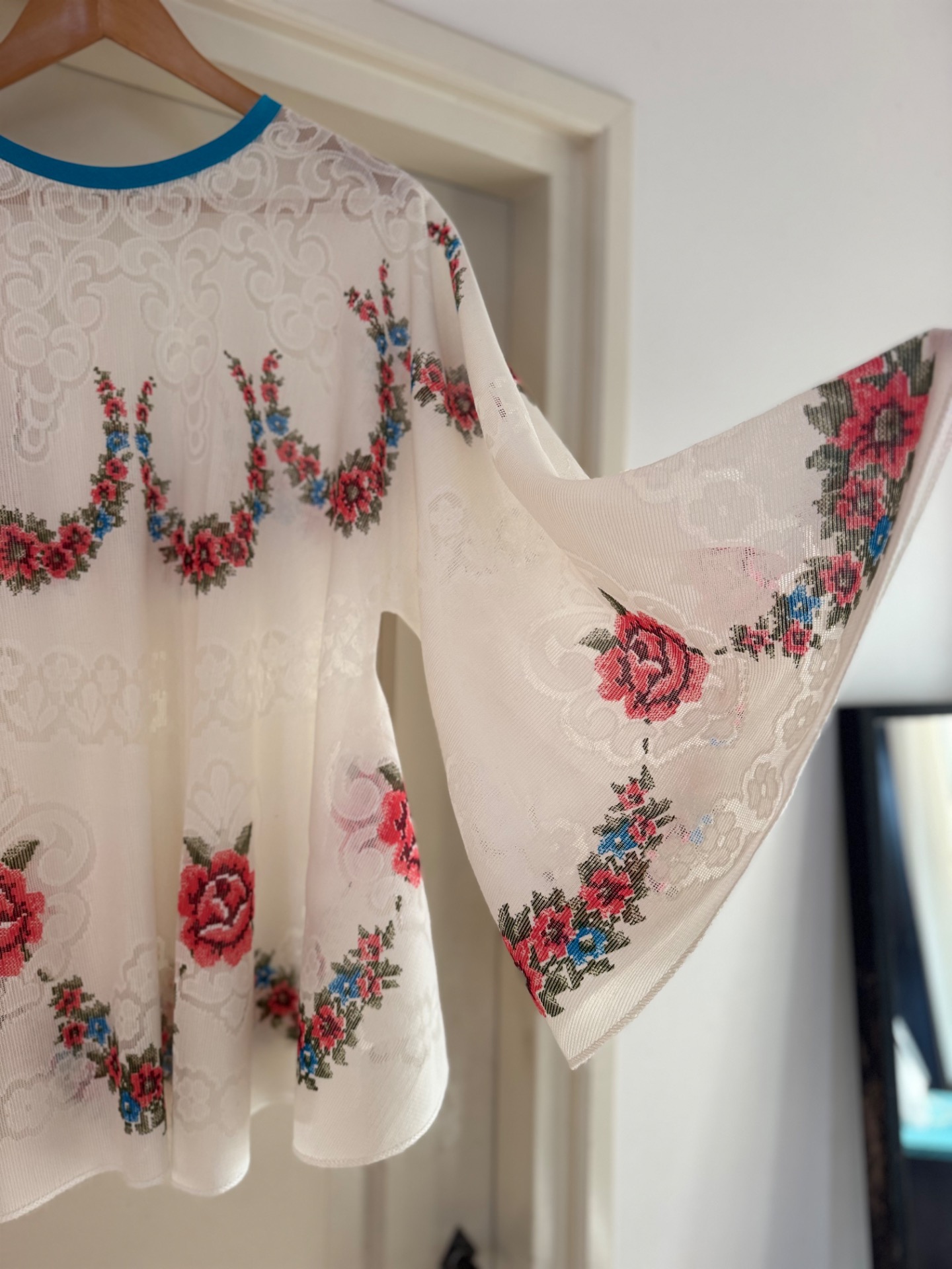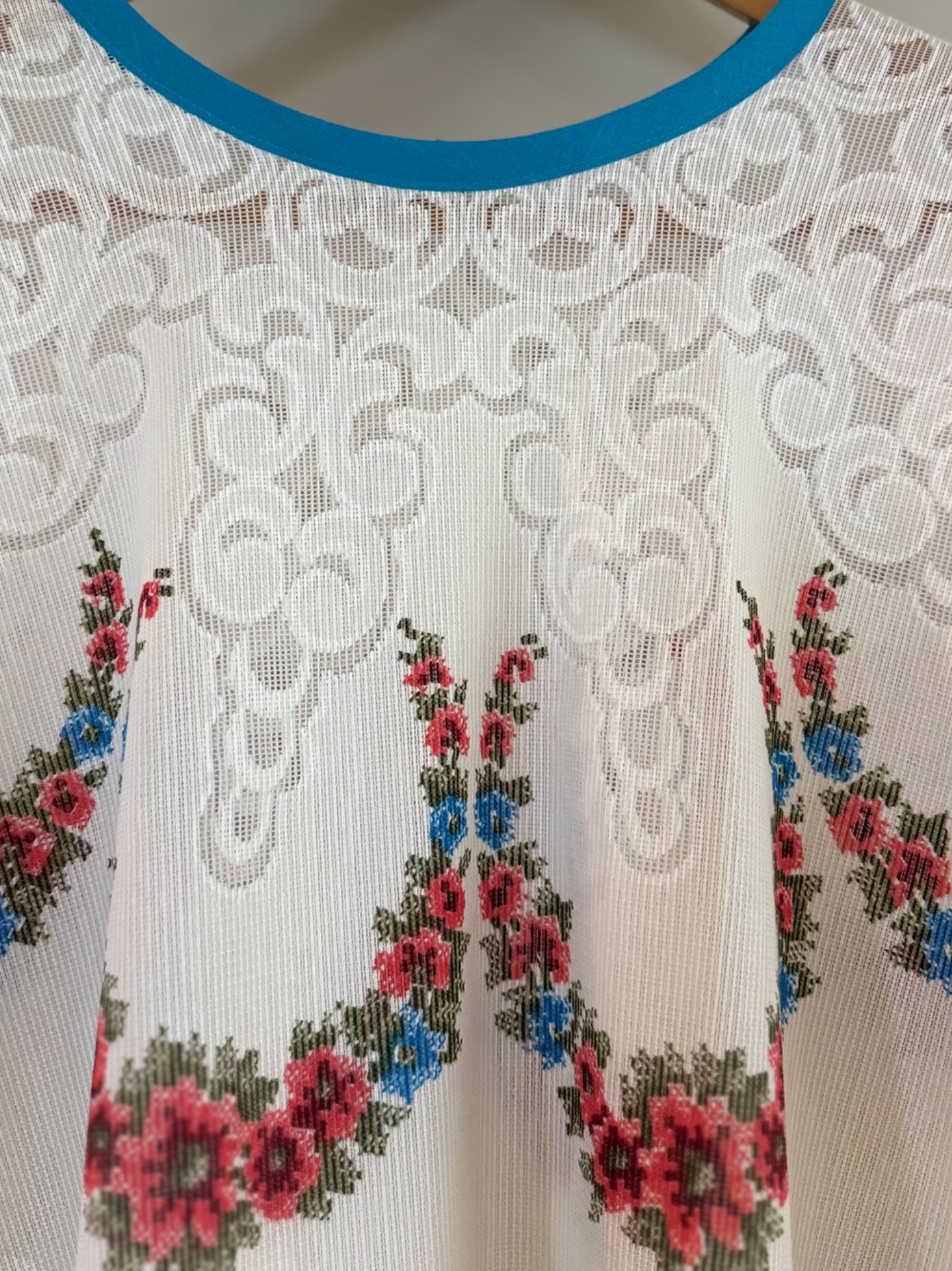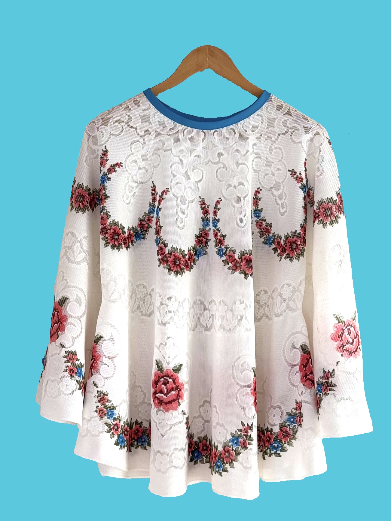 Gemaakt van prachtig kanten vintage tafelkleed, heb je met deze Happy Angel een echte showstopper in huis. Leuk op een spijkerbroek of over je bikini op het strand. Spreidt je armen en je bent net een sneeuwengel in de zon. Lief met die bloemetjes en vrolijk met de turqoise bies.