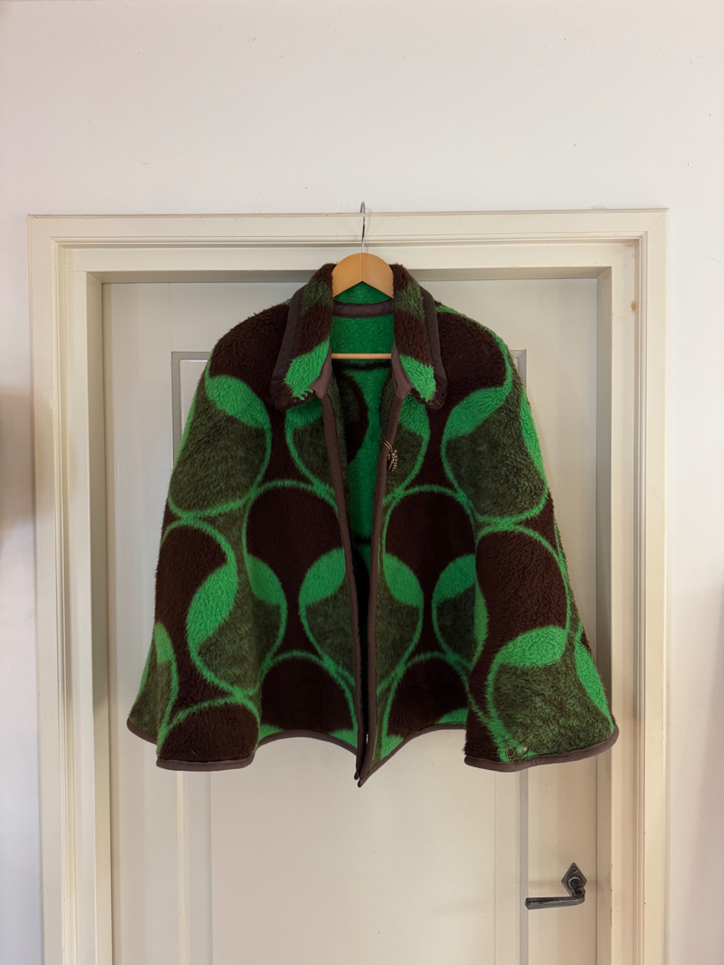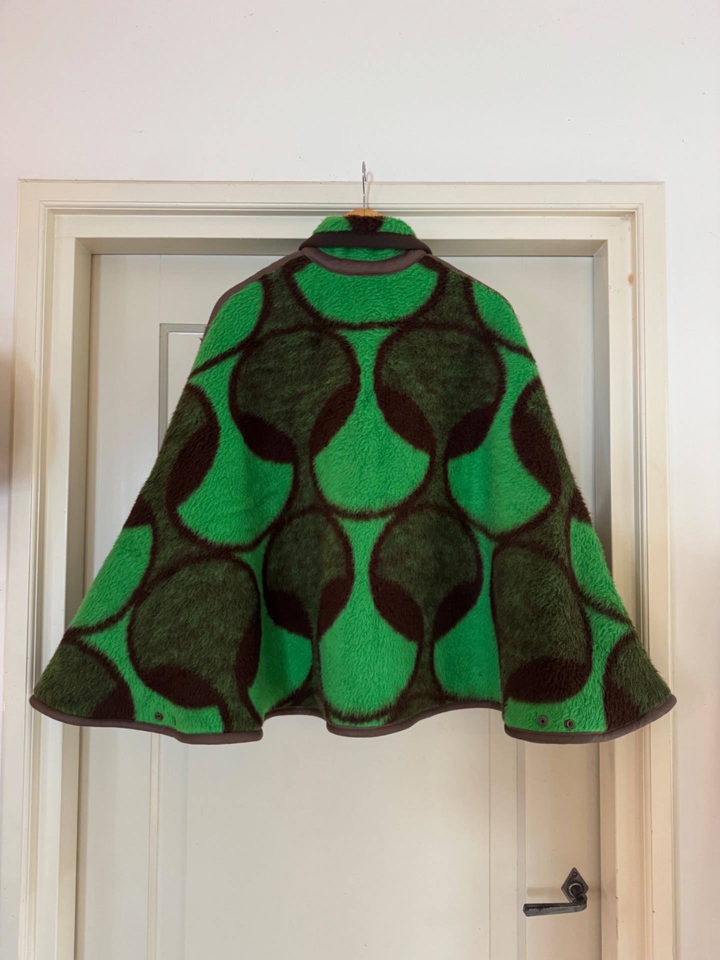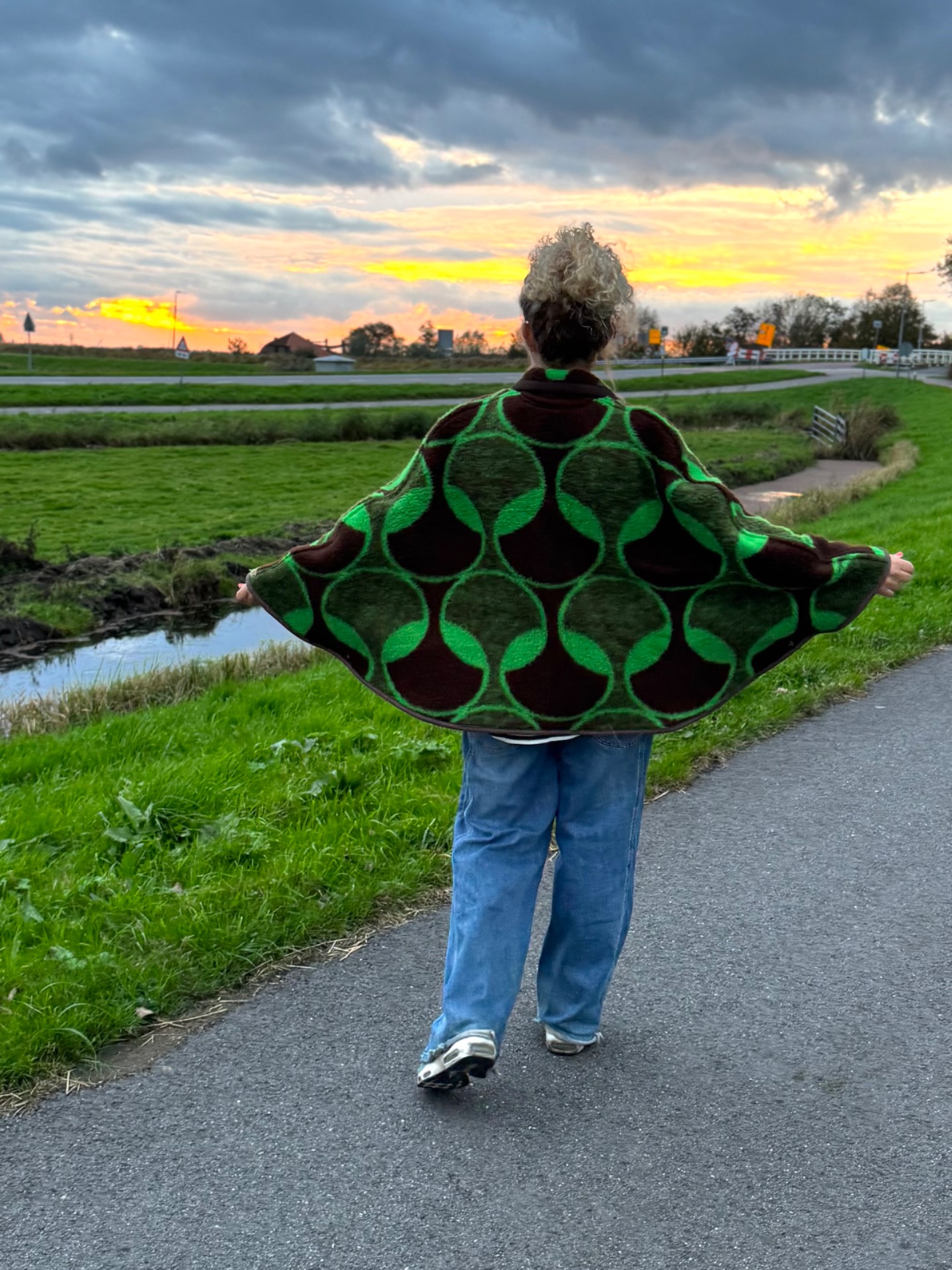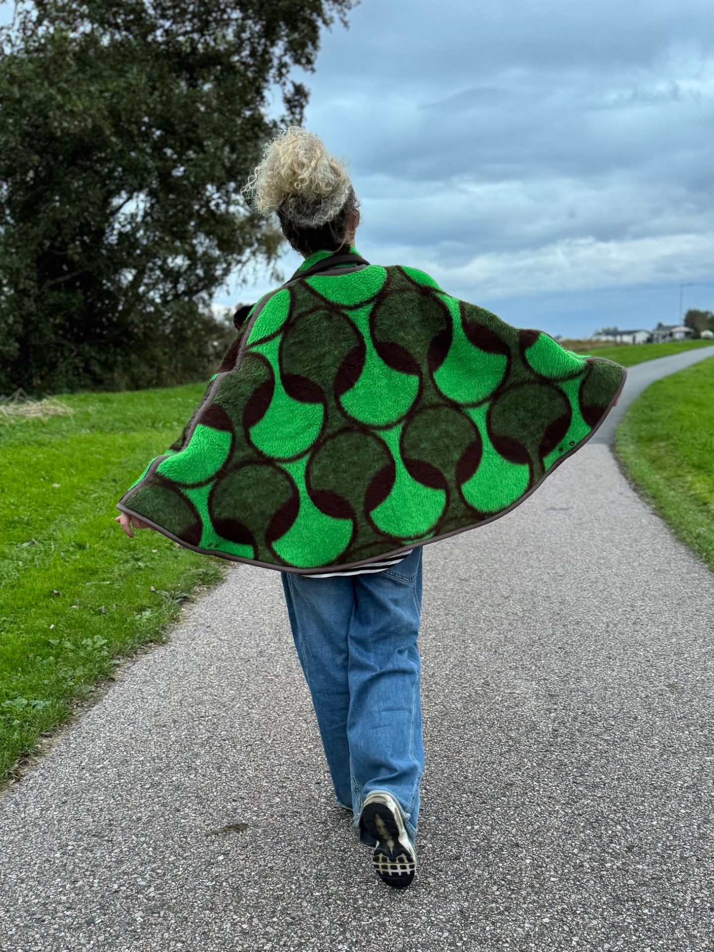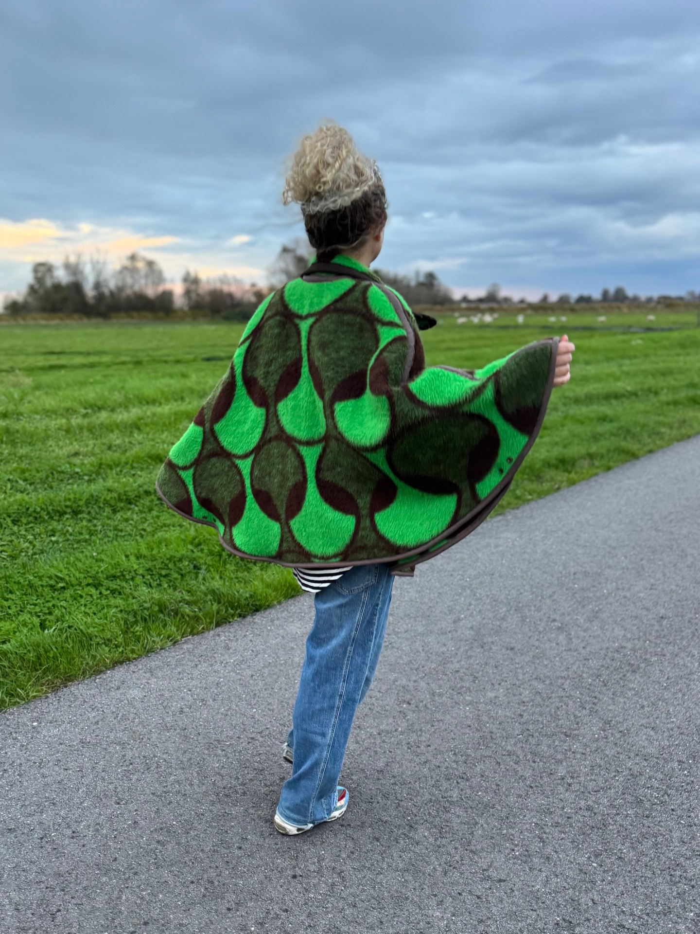 Is het een jas? Is het een cape? Het is een Happy Cape! Met de armen langs je lijf, ziet 'ie eruit als een jas, maar ga je in vliegtuigstand, dan komen de vleermuismouwen tevoorschijn. Door de drukknopen, krijg je een mouw gevoel en ze zitten aan twee kanten, want natuurlijk kun je deze Happycoat ook weer aan twee kanten dragen.
