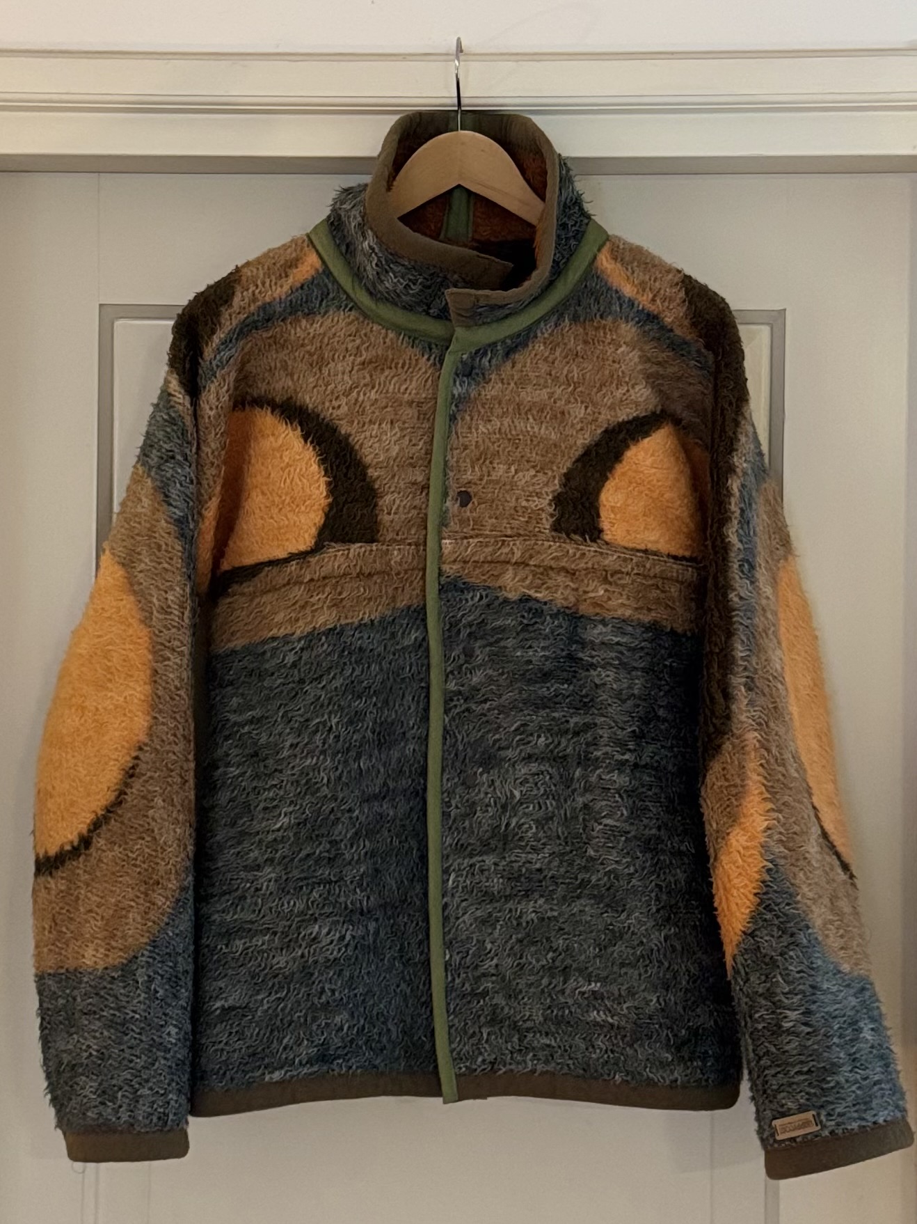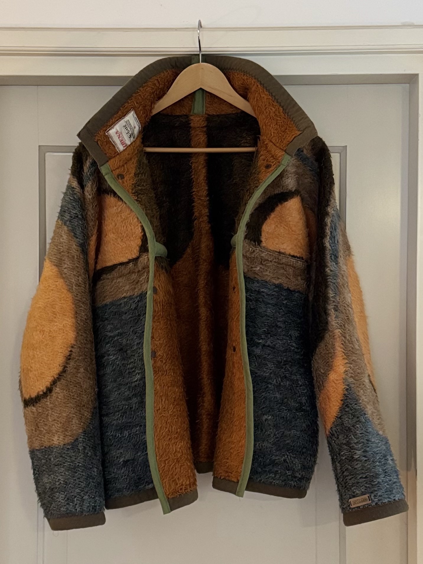 List of ingredients: Made from an original dutch Dralonblanket from the 70's. That means soft, washable, acrylic, relatively light fiber to keep you cozy wherever you go. Cotton tape for extra funkiness and brown snaps to close it when it’s cold outside.