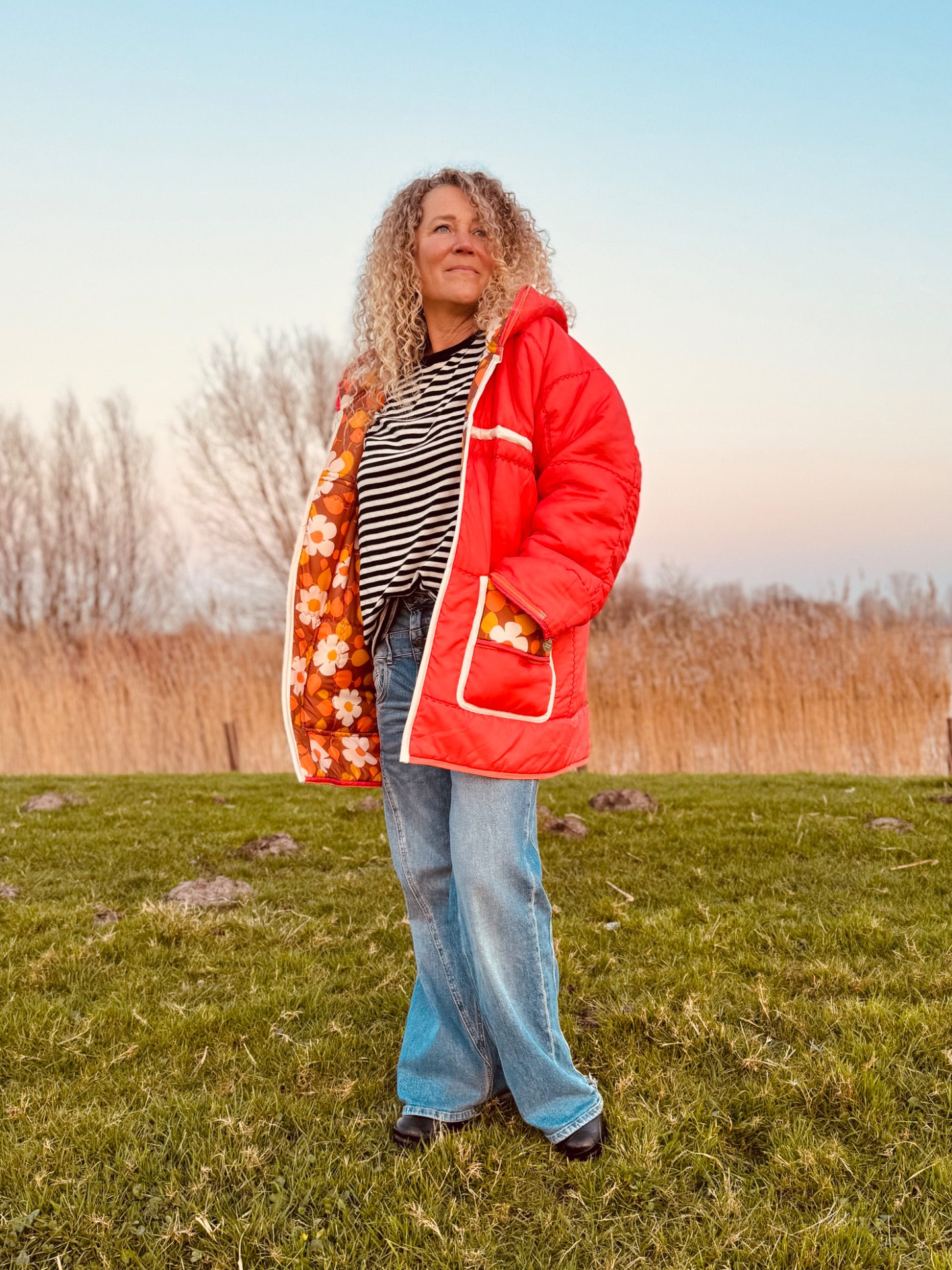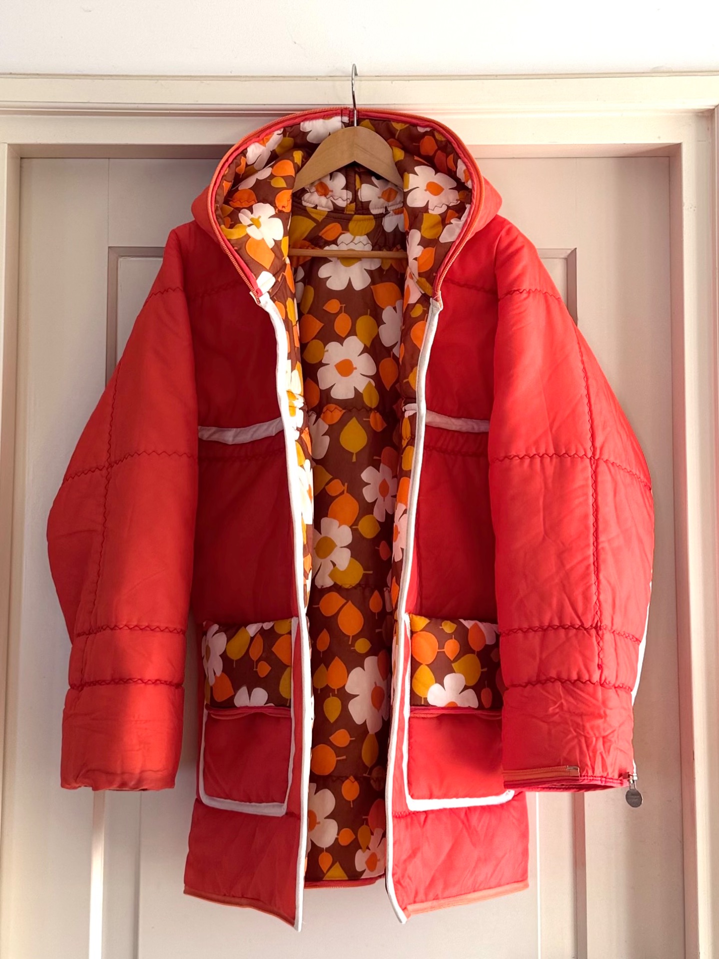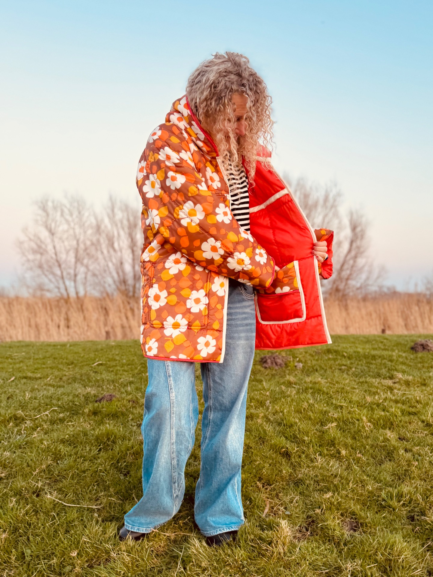 Deze leukerd is gemaakt van een vintage jaren ‘70 slaapzak uit Frankrijk. De twee kanten zijn totaal verschillend, dus eigenlijk zijn het twee jassen ;-) Hij is heerlijk warm en de originele ritsen vind je op de gekste plekken terug! Met leuke zakken aan de knaloranje kant