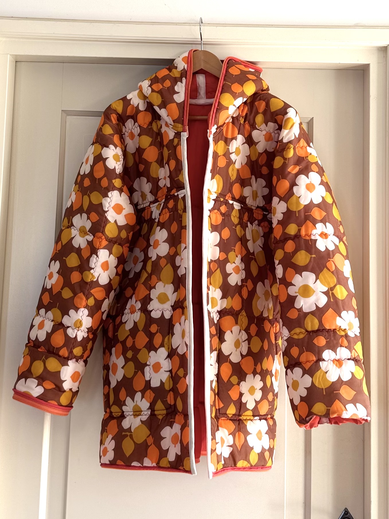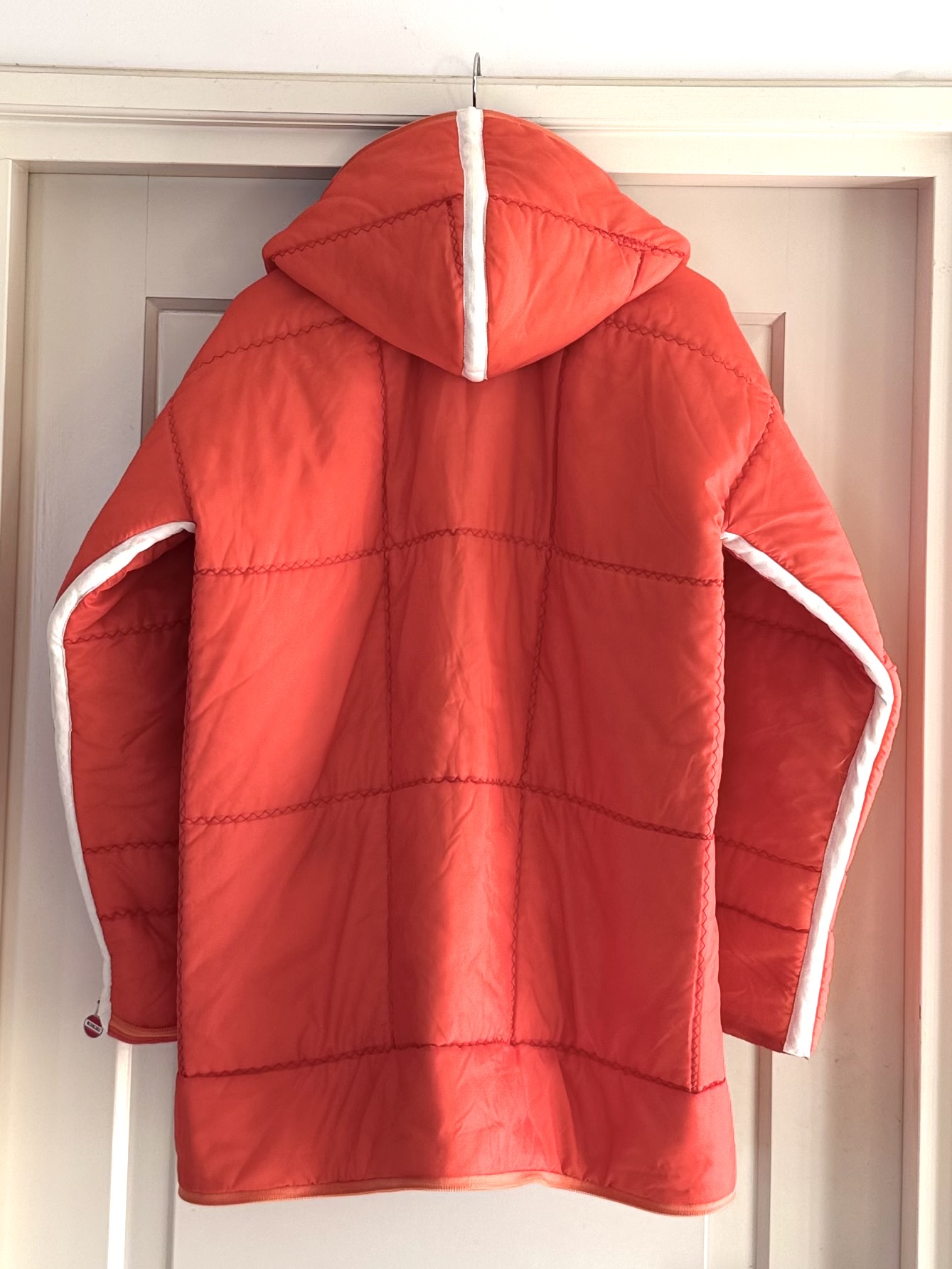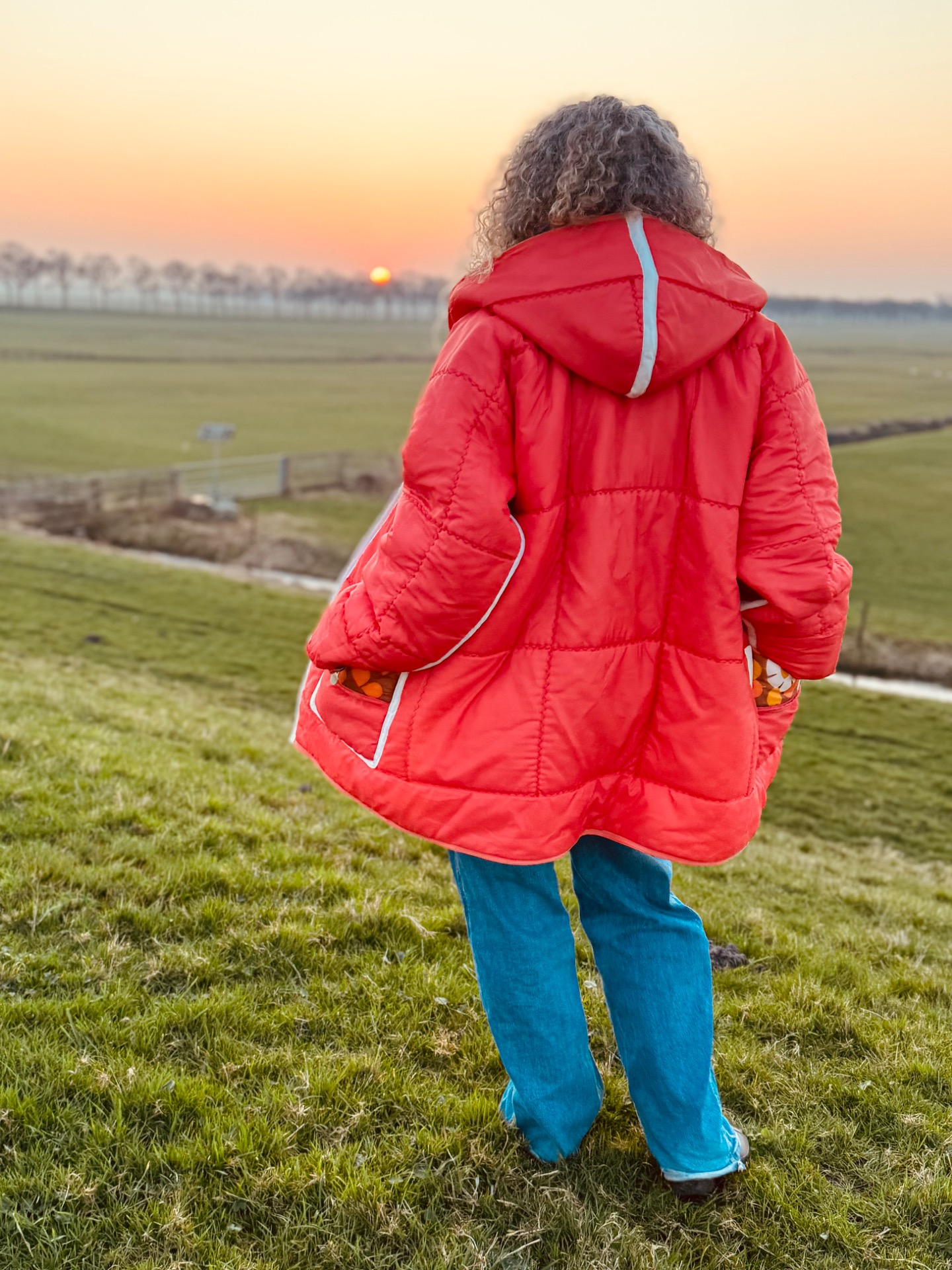 Deze leukerd is gemaakt van een vintage jaren ‘70 slaapzak uit Frankrijk. De twee kanten zijn totaal verschillend, dus eigenlijk zijn het twee jassen ;-) Hij is heerlijk warm en de originele ritsen vind je op de gekste plekken terug! Met leuke zakken aan de knaloranje kant