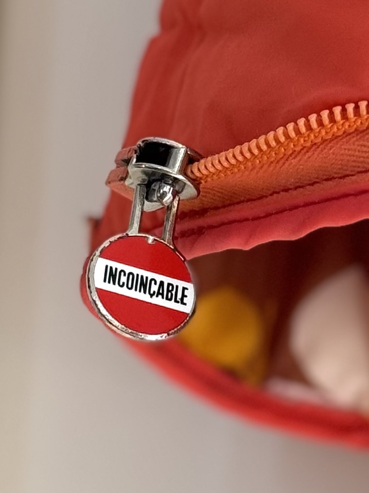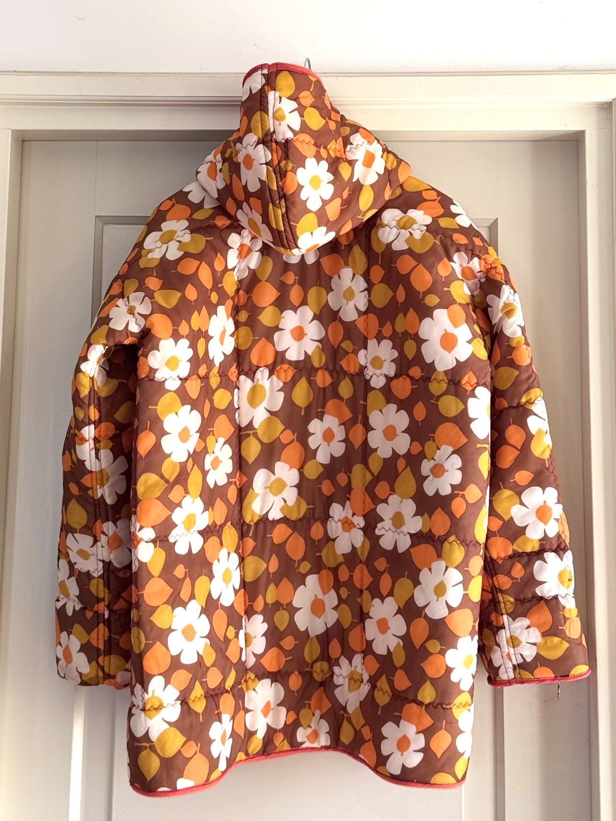 List of ingredients: Made out of a vintage French sleepingbag from the 70's. That means soft, washable, acrylic, relatively light fiber to keep you cozy wherever you go. Cotton tape for extra funkiness and pink press studs.