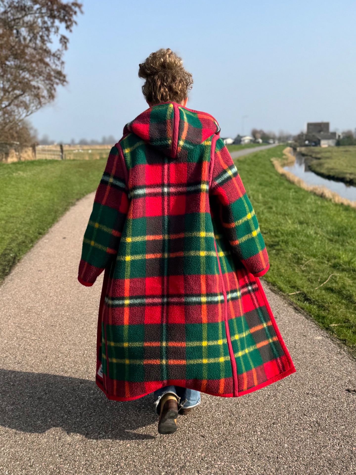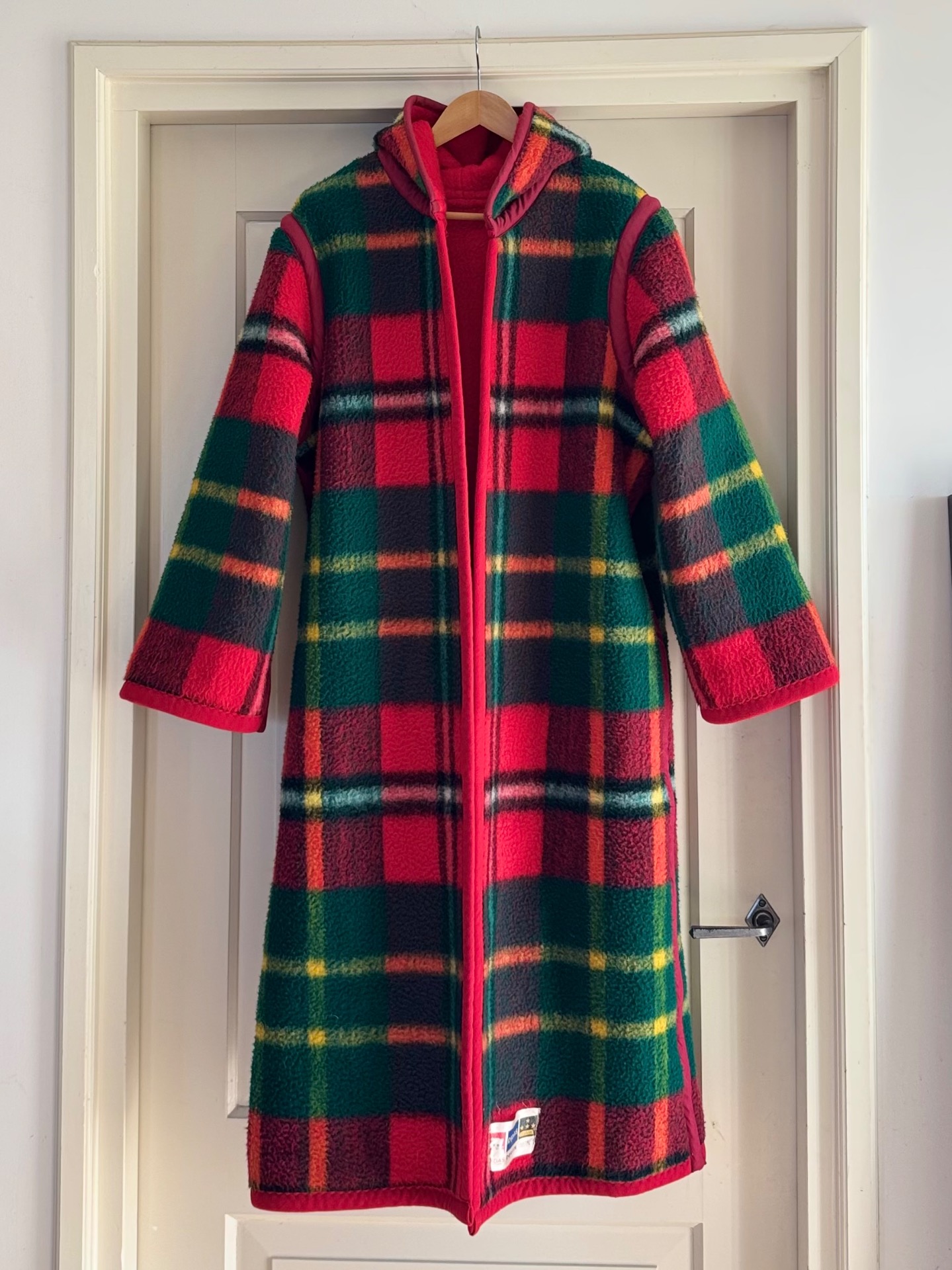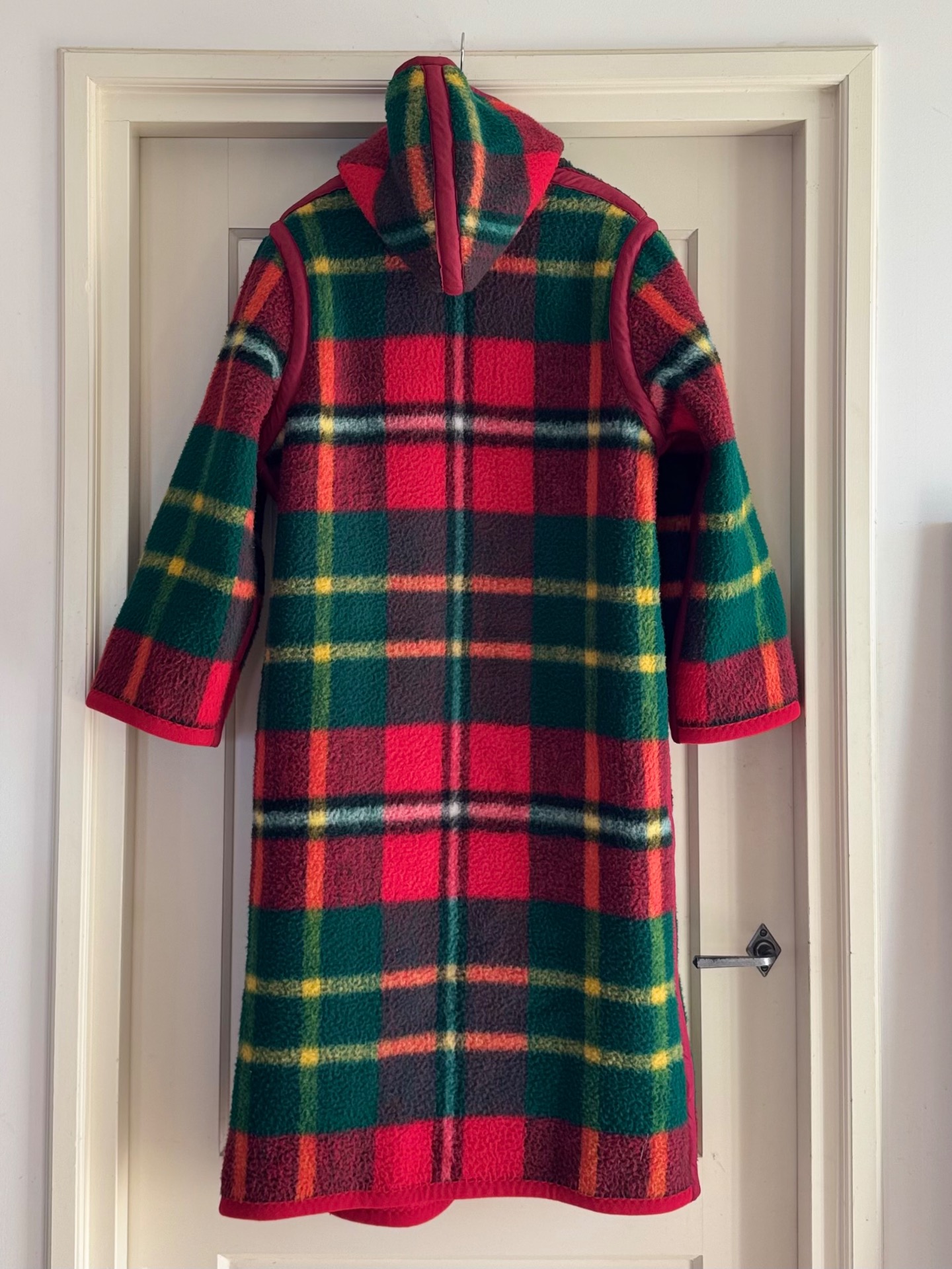 Dit is nou waar je aan denkt bij de geruite jas. Toch? En als je hem omdraait heb je een effen knalrode lange jas. Die ziet er zo totaal anders uit dat je eigenlijk 2 jassen-in-1 hebt. Hij is lekker dik en het wijnrode band maakt 'm soort van chique.