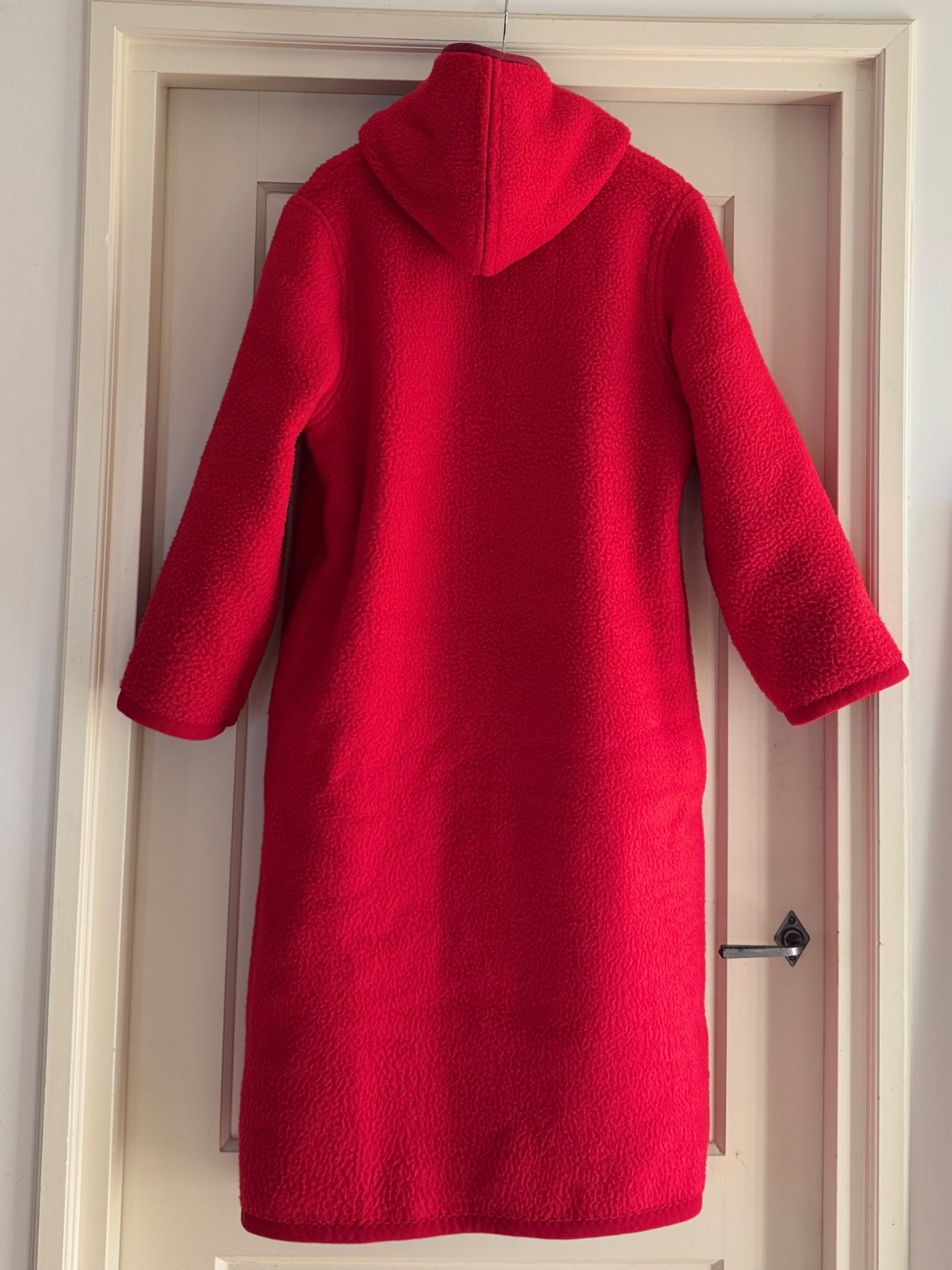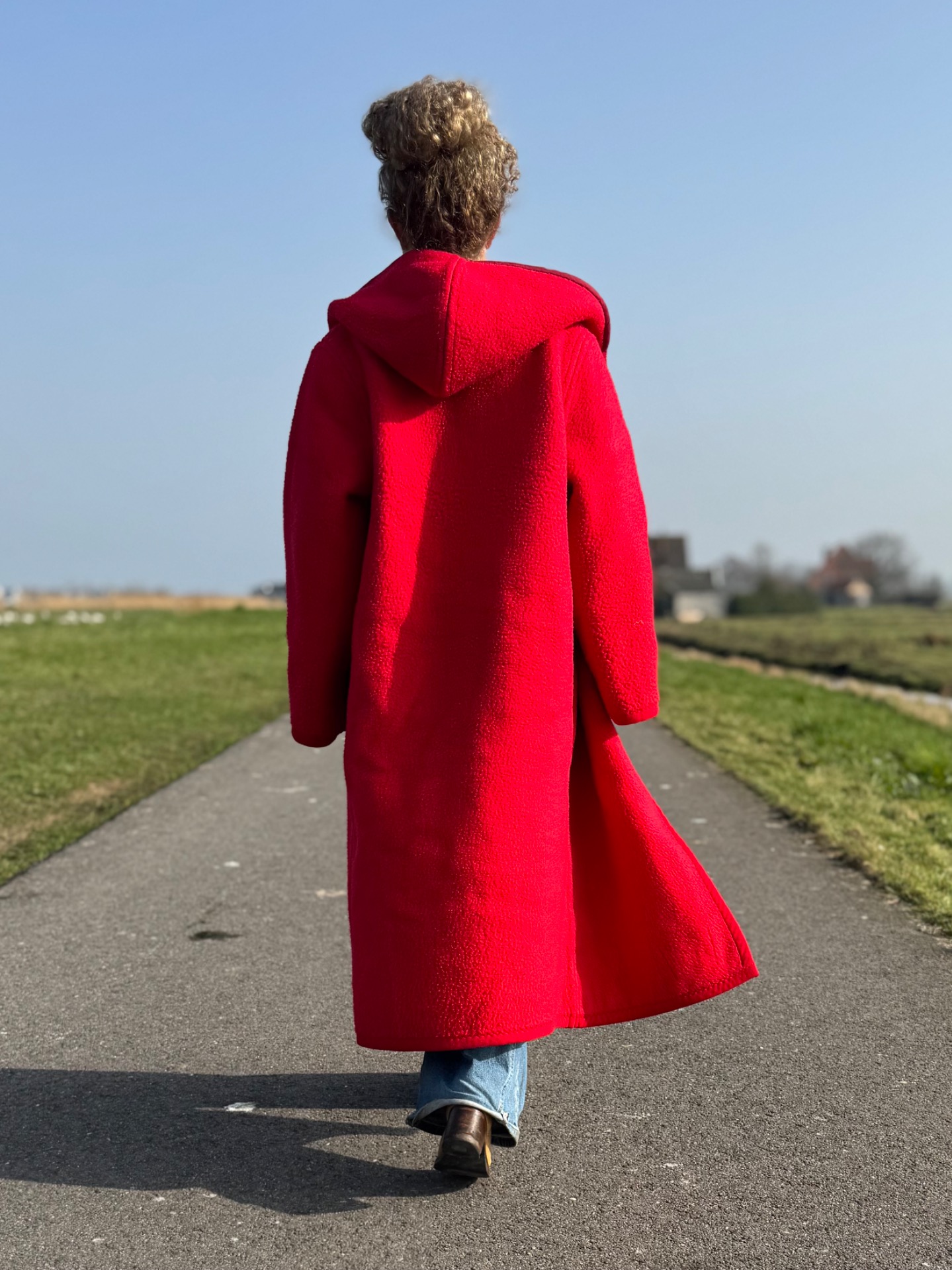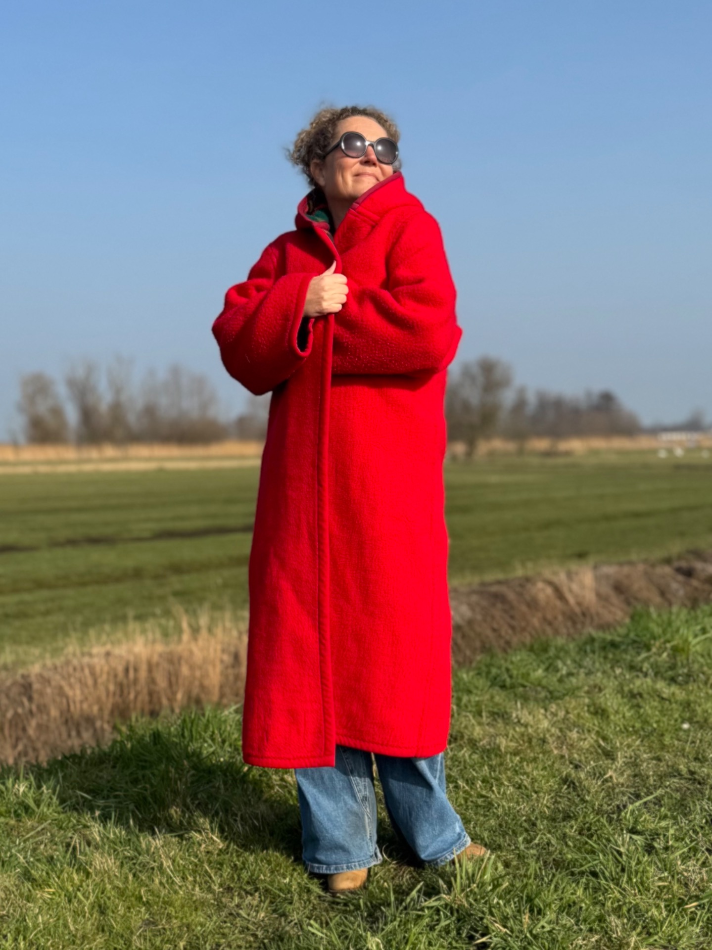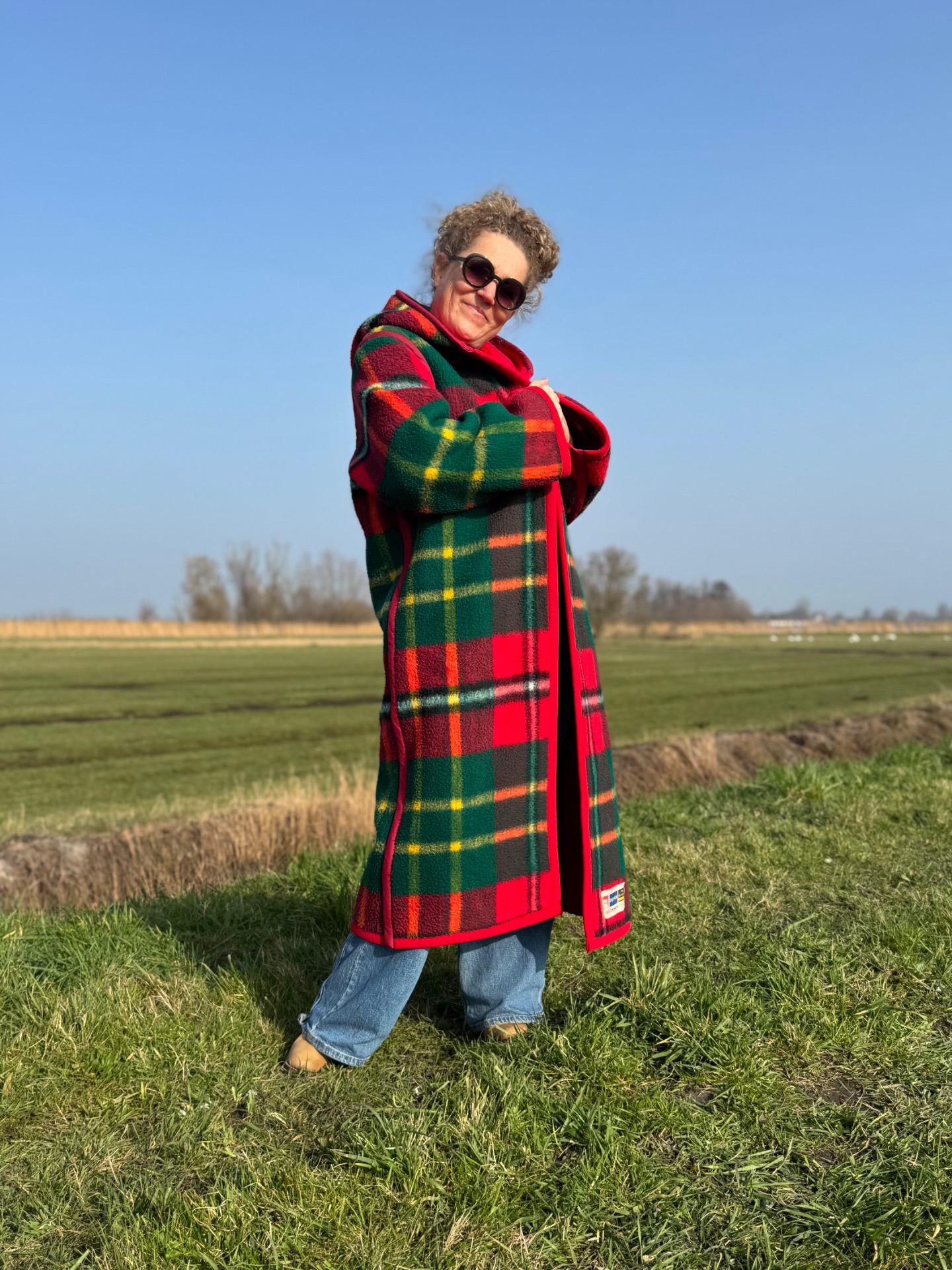 Dit is nou waar je aan denkt bij de geruite jas. Toch? En als je hem omdraait heb je een effen knalrode lange jas. Die ziet er zo totaal anders uit dat je eigenlijk 2 jassen-in-1 hebt. Hij is lekker dik en het wijnrode band maakt 'm soort van chique.