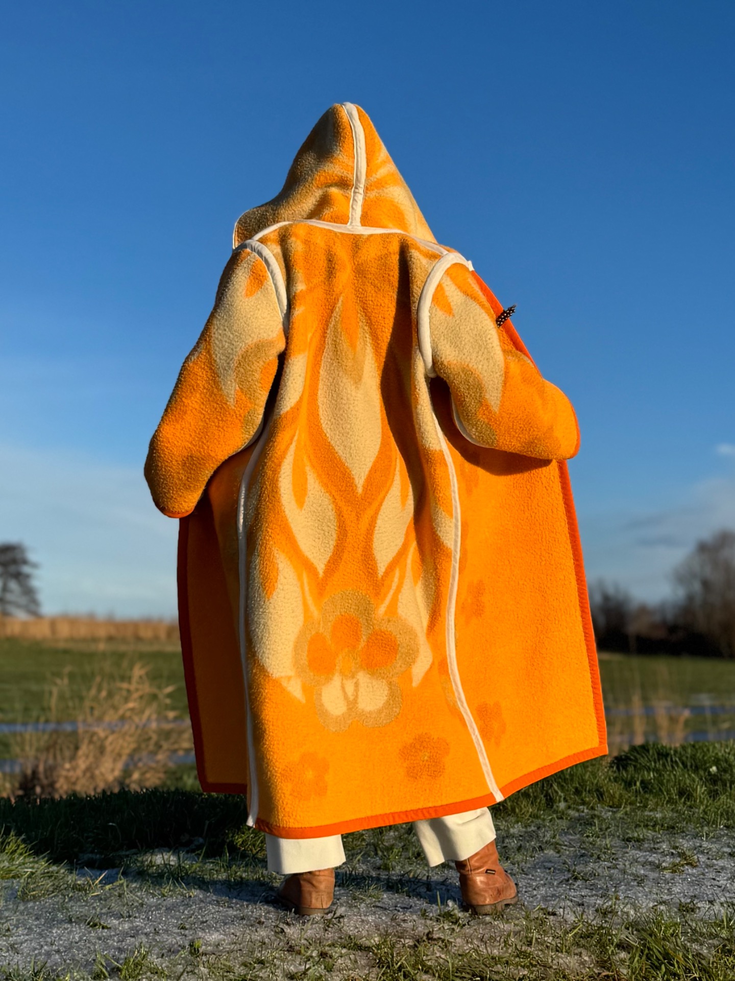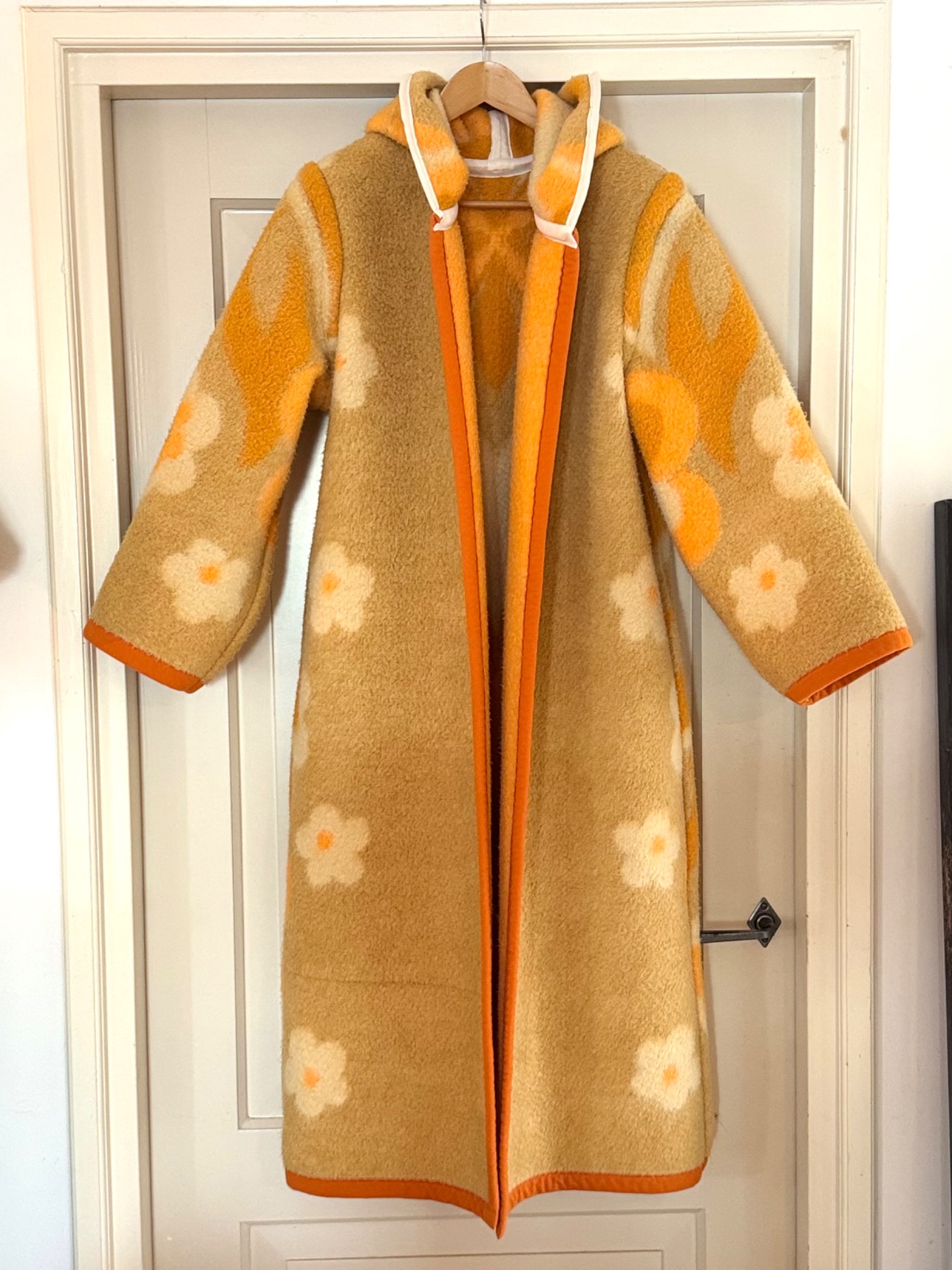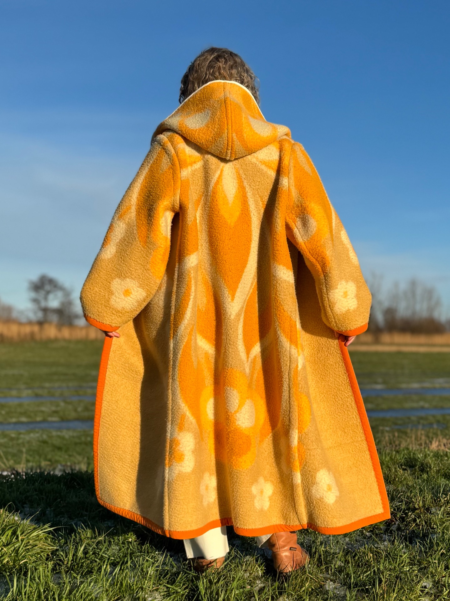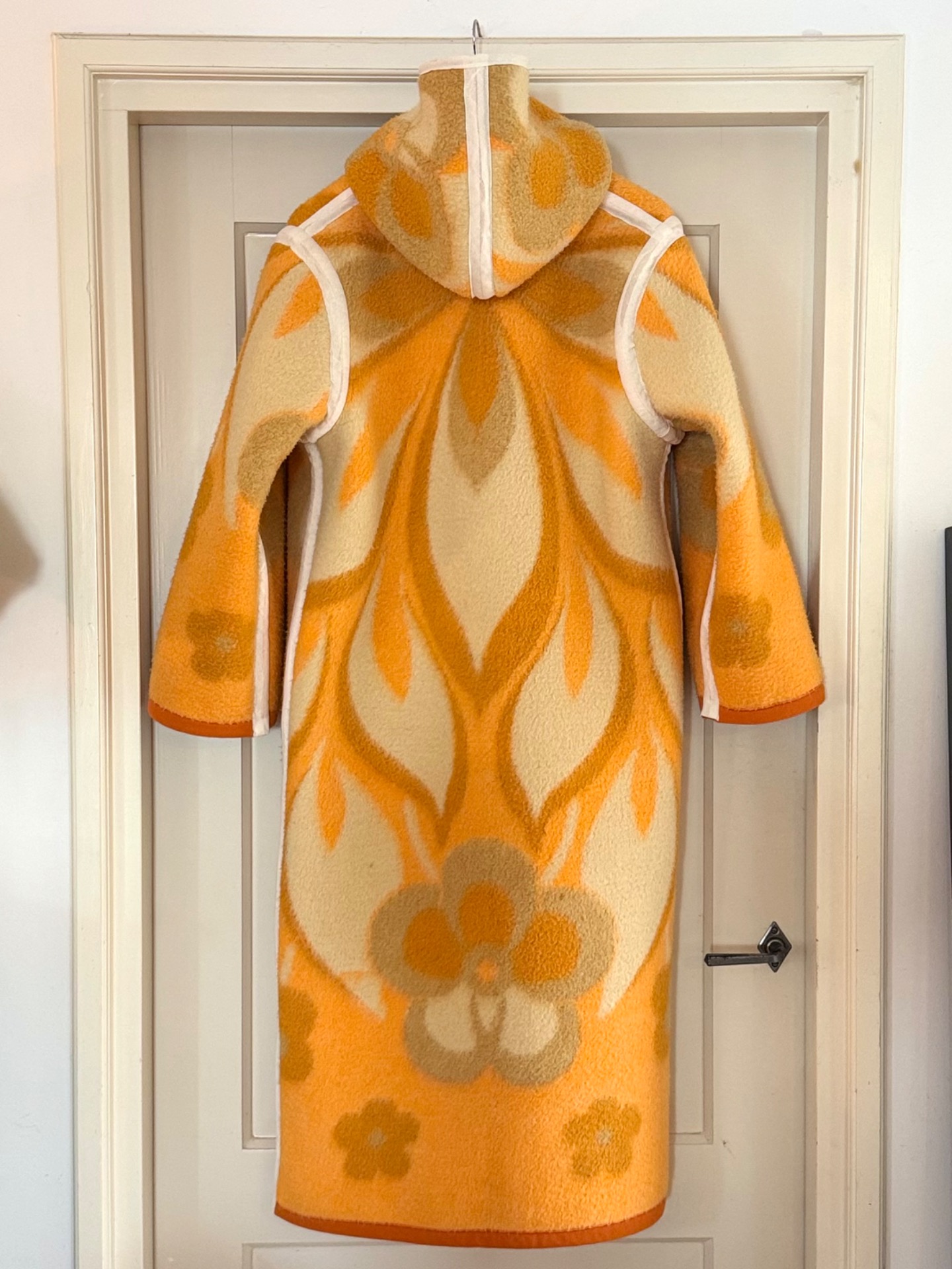 This long coat with hoody has 2 moods. One salmon met white and beige, one beige with salmon and white. So in fact you get 2 coats for the price of one