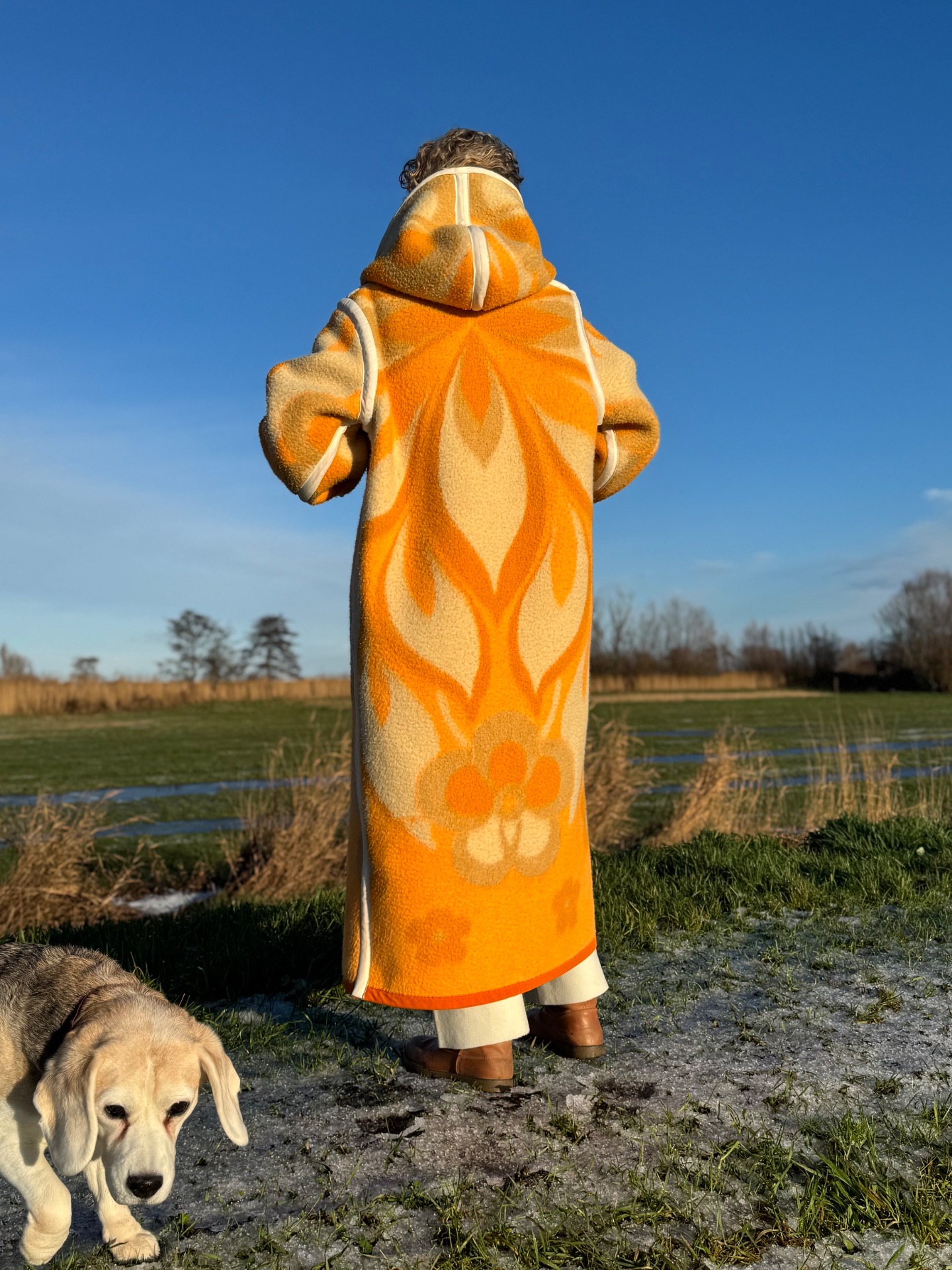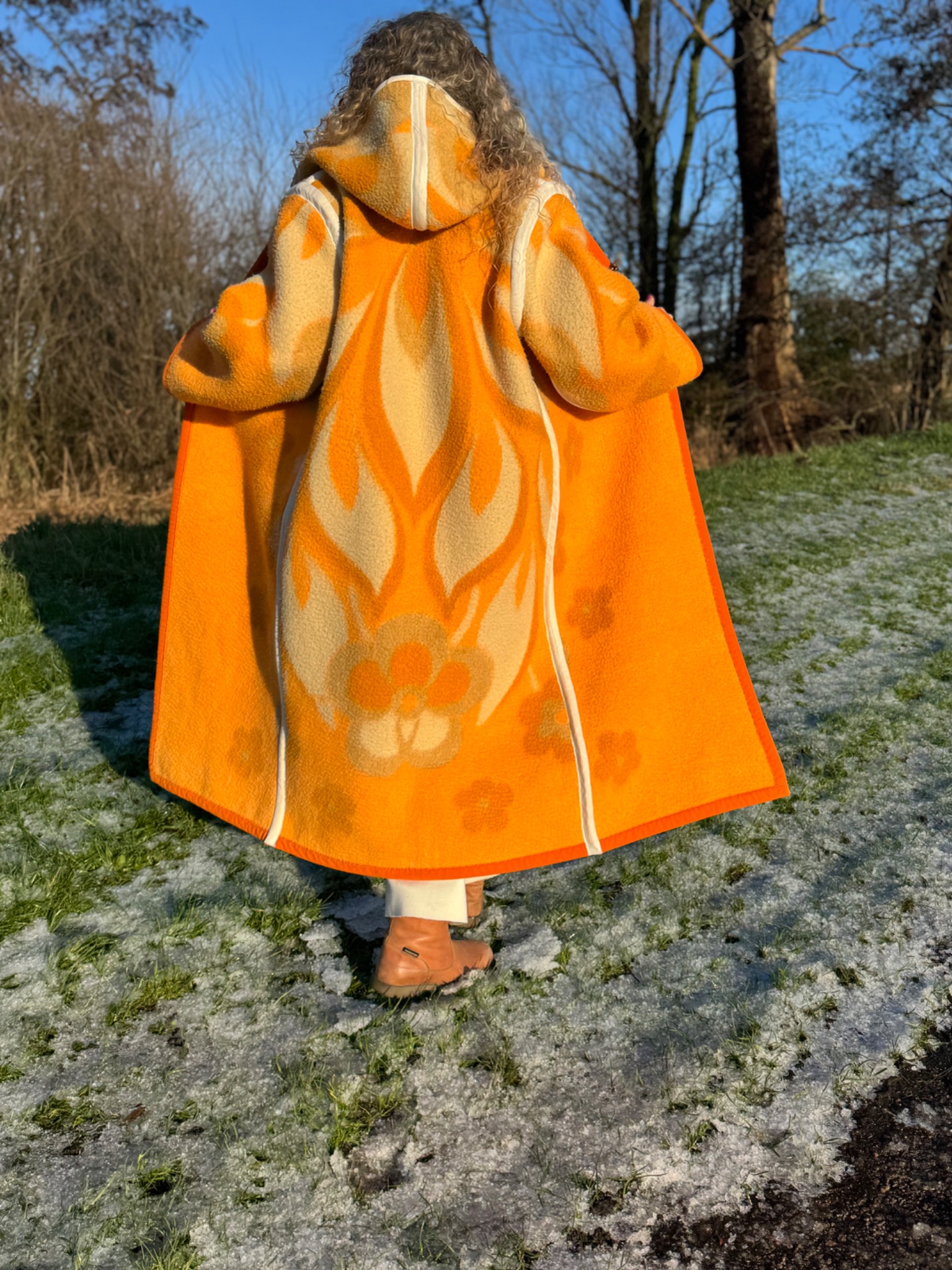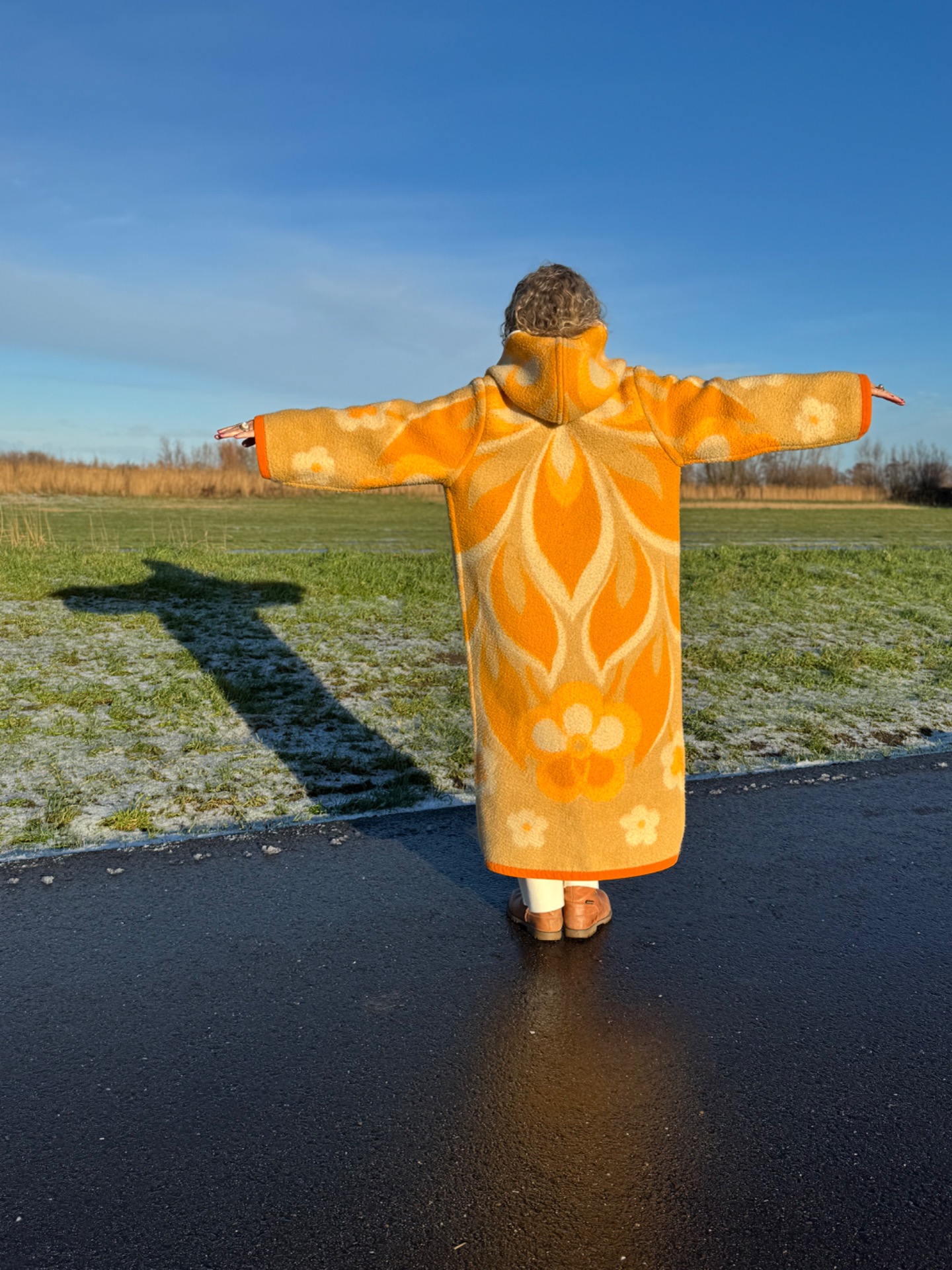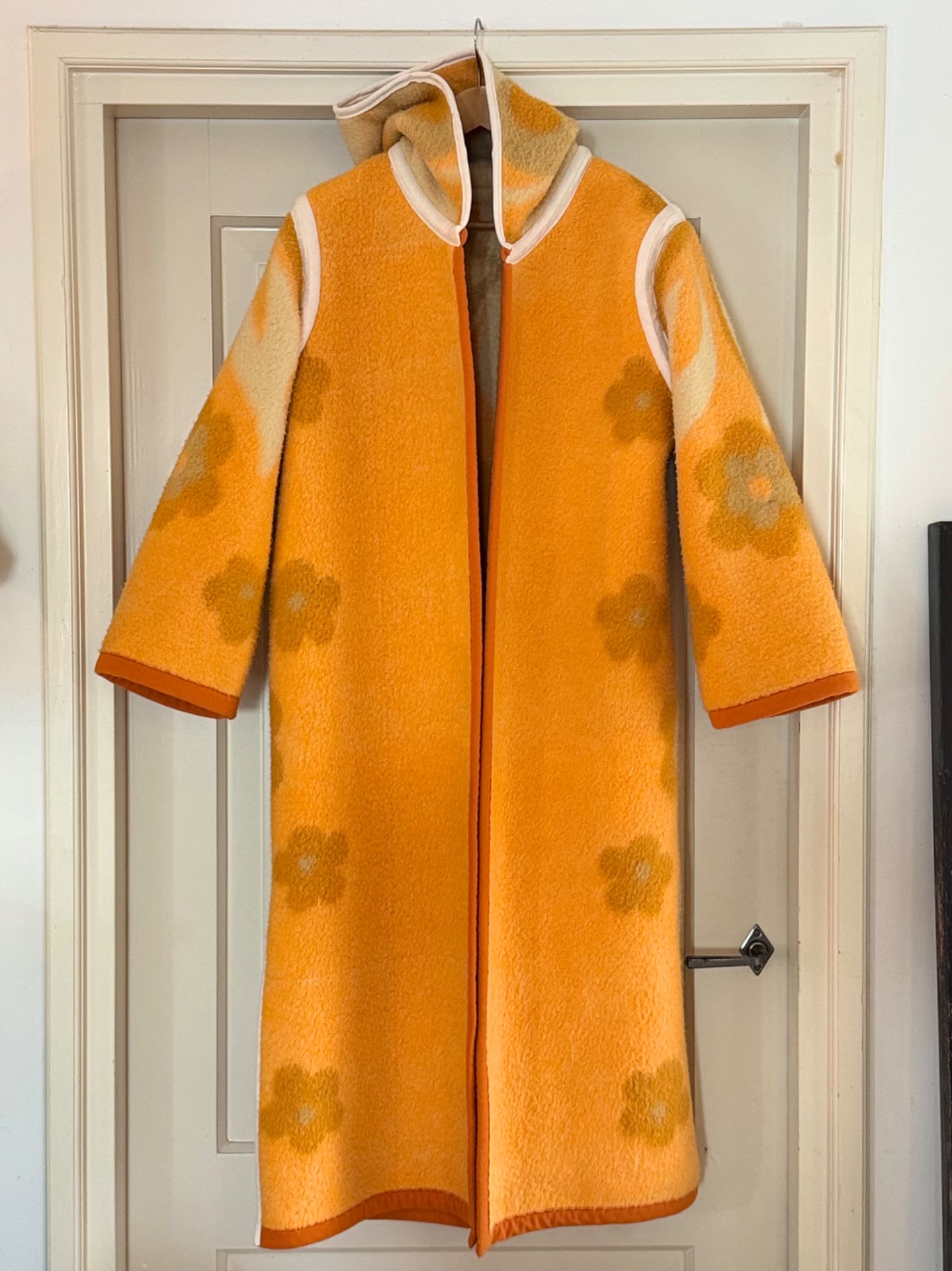 This long coat with hoody has 2 moods. One salmon met white and beige, one beige with salmon and white. So in fact you get 2 coats for the price of one