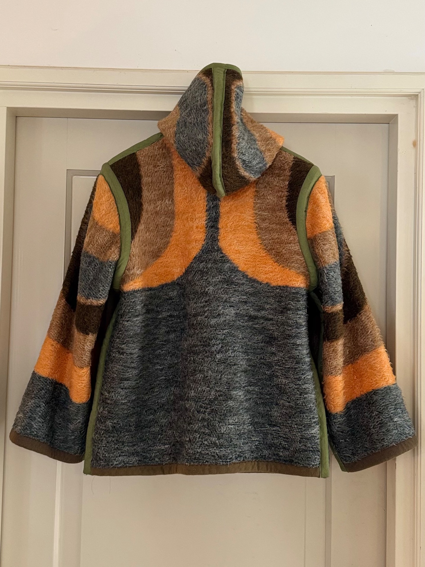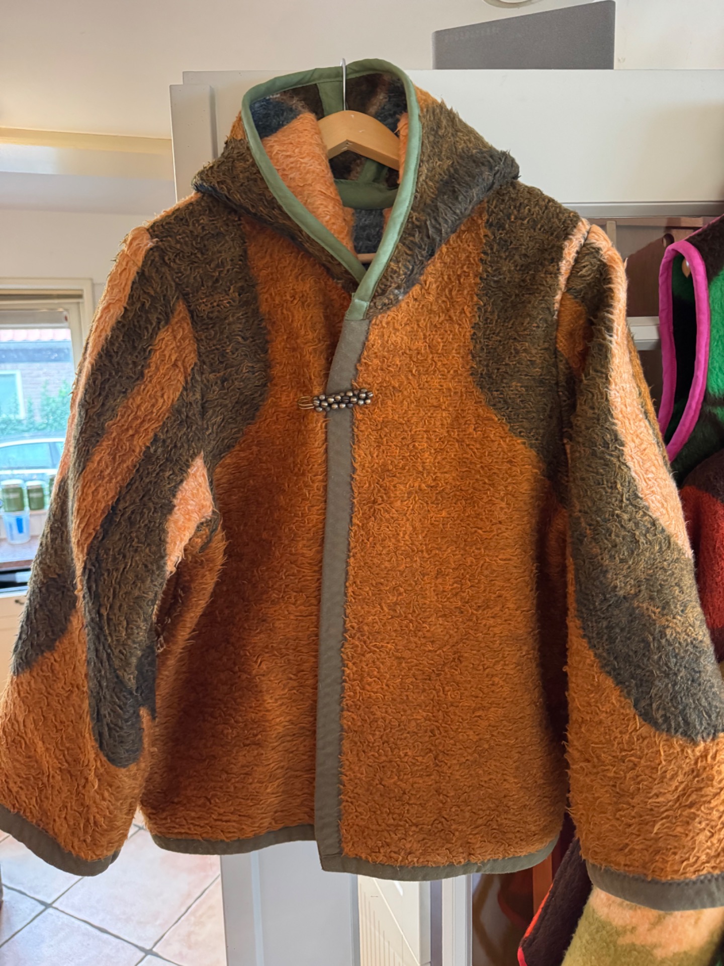 Deze Shorty heeft echt twee gezichten. De ene grijs met bruin, de andere warmbruin met zalm. De deken zelf is een beetje 'ruig' dus lekker aaibaar en heeft als eerste shorty een lekkere capuchon. Hij is niet heel kort en zeker niet lang, dus net over je billen zo'n beetje.