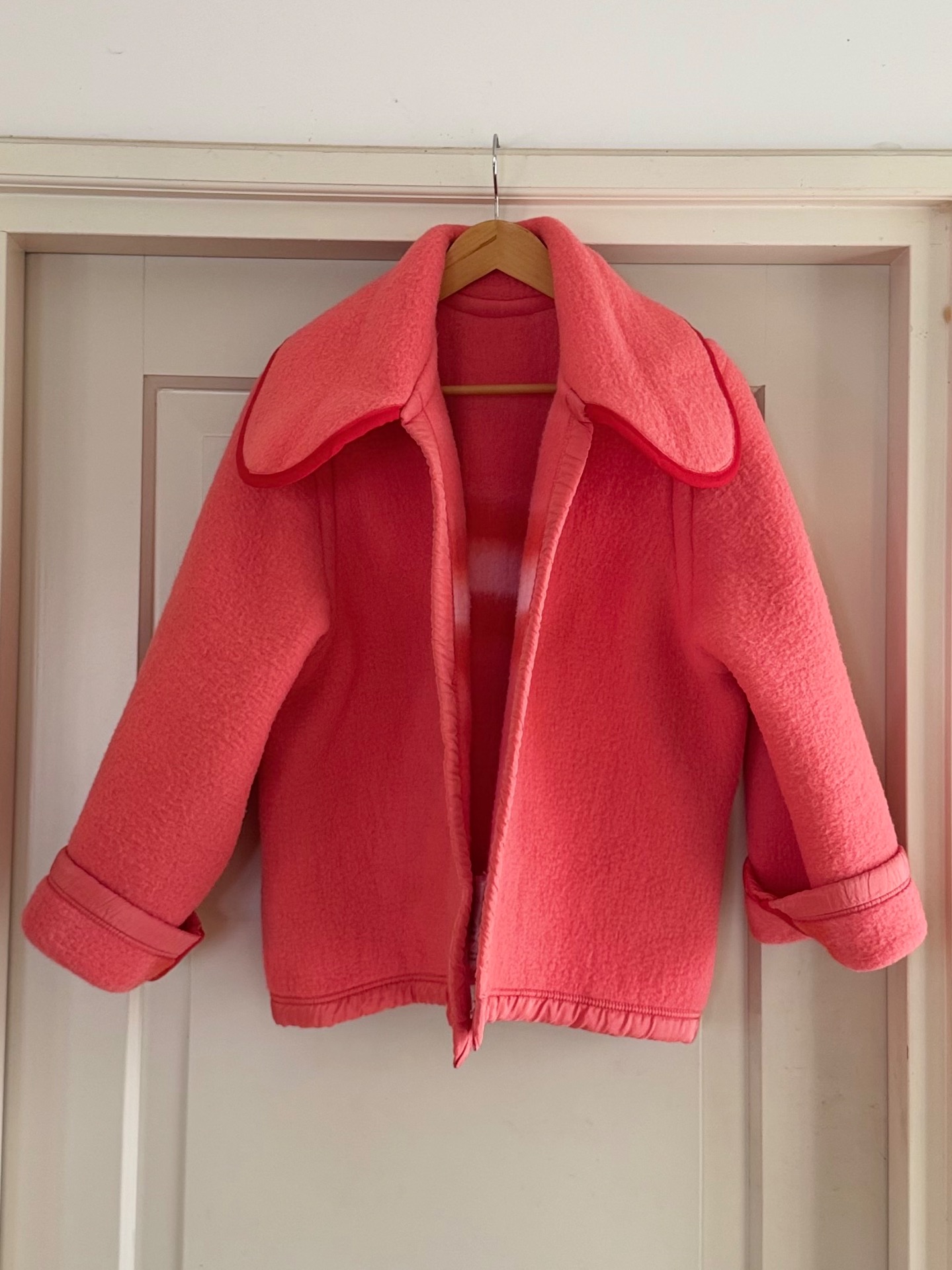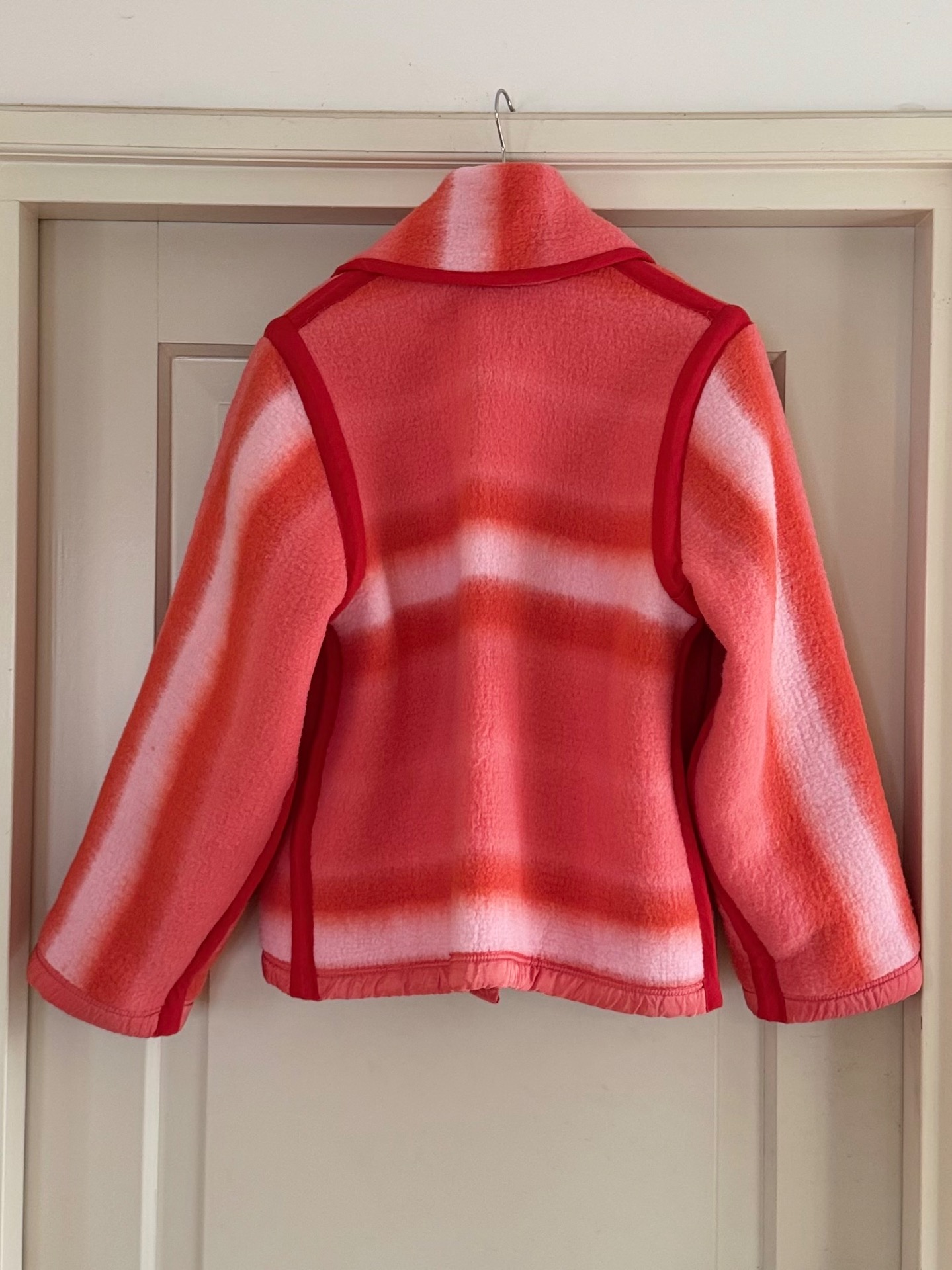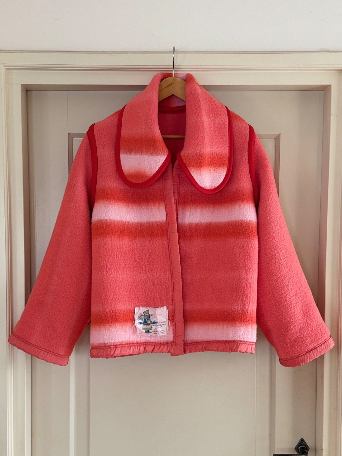 Heerlijk zonnige warme deken in roze, rood en wit. Met een enorme grote jaren ‘70 kraag en knalrode afwerking.