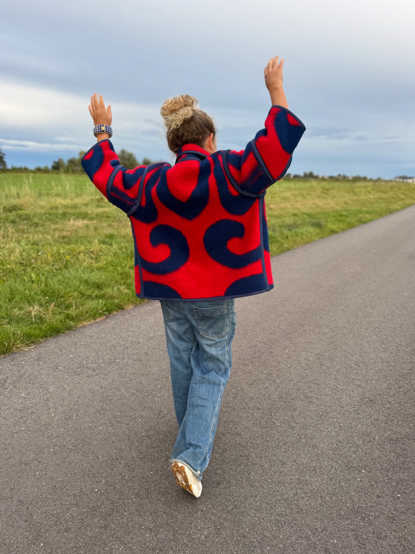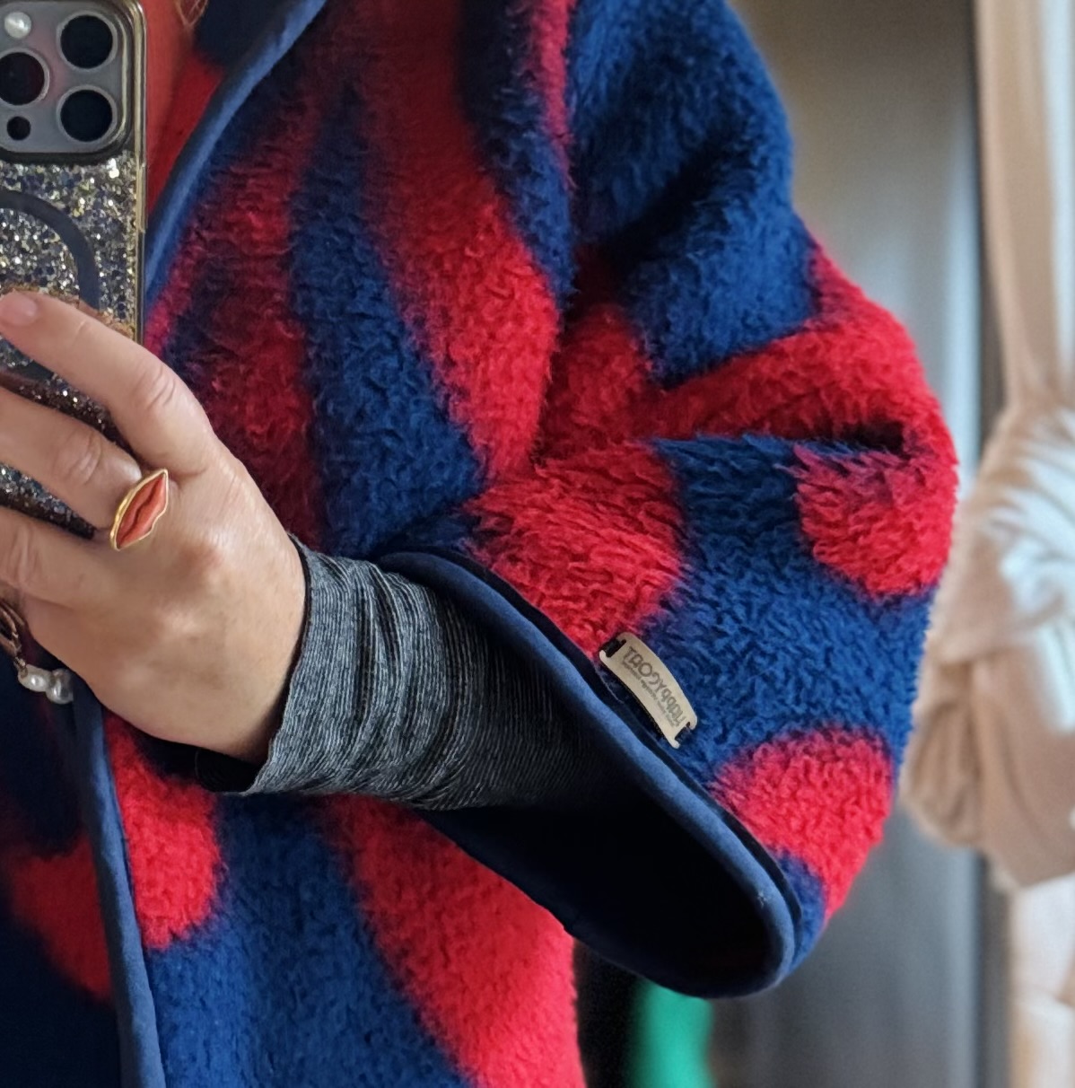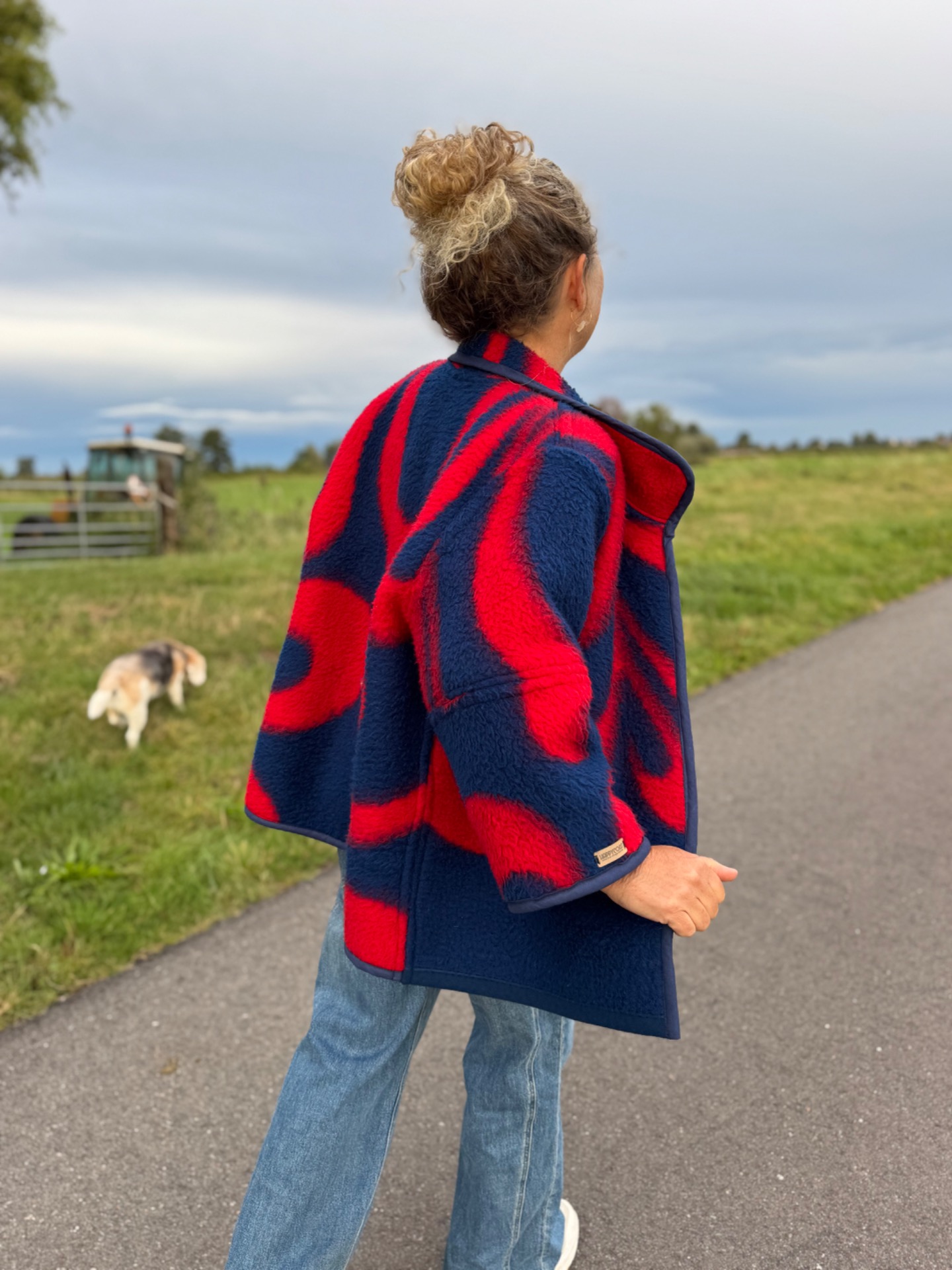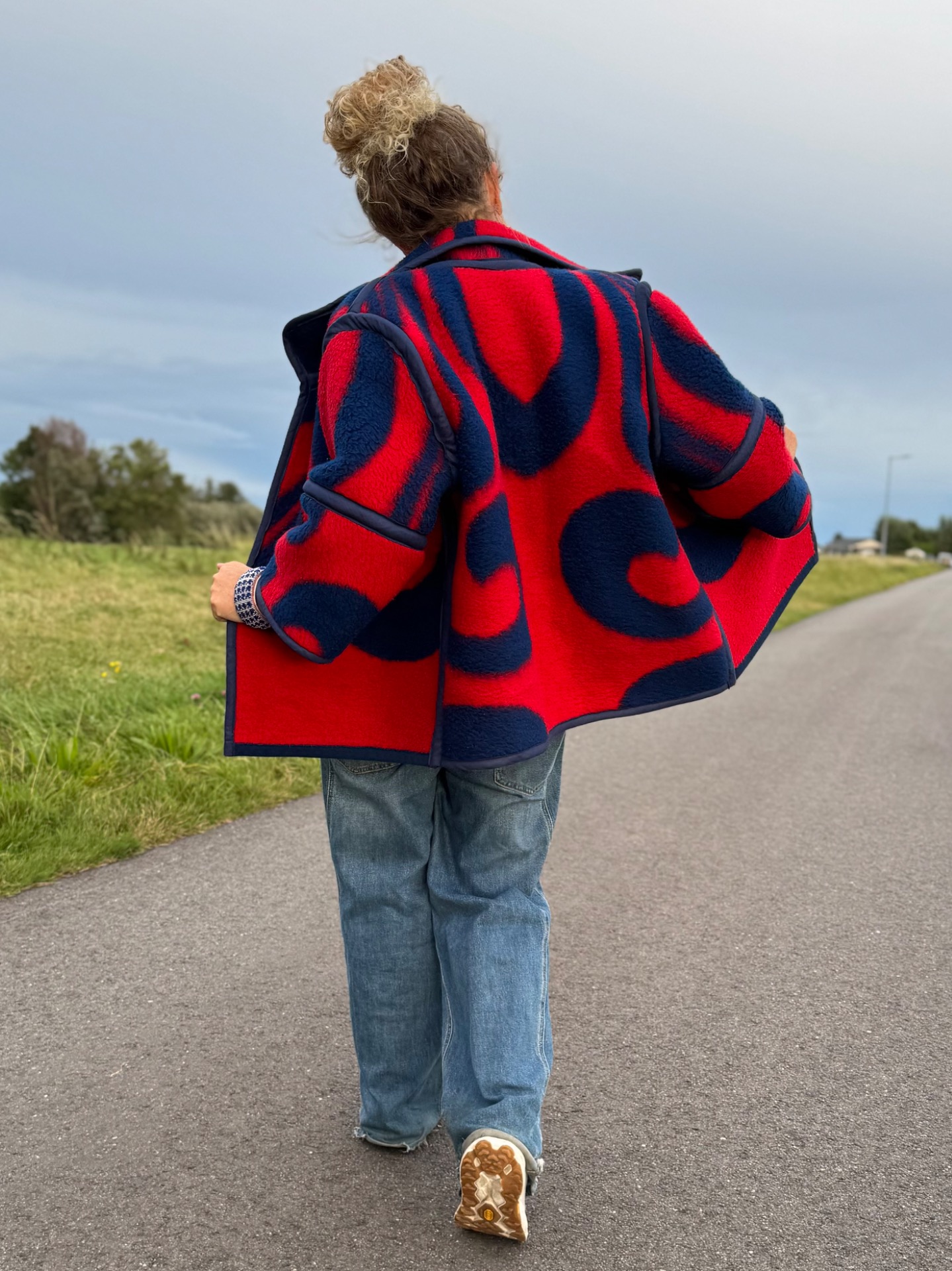 List of ingredients: Made from an original dutch Dralon blanket from the 70's. That means soft, washable, acrylic, relatively light fiber to keep you cozy wherever you go. Cotton tape for extra funkyness and if you wish: 2 red clickbuttons to close the front.