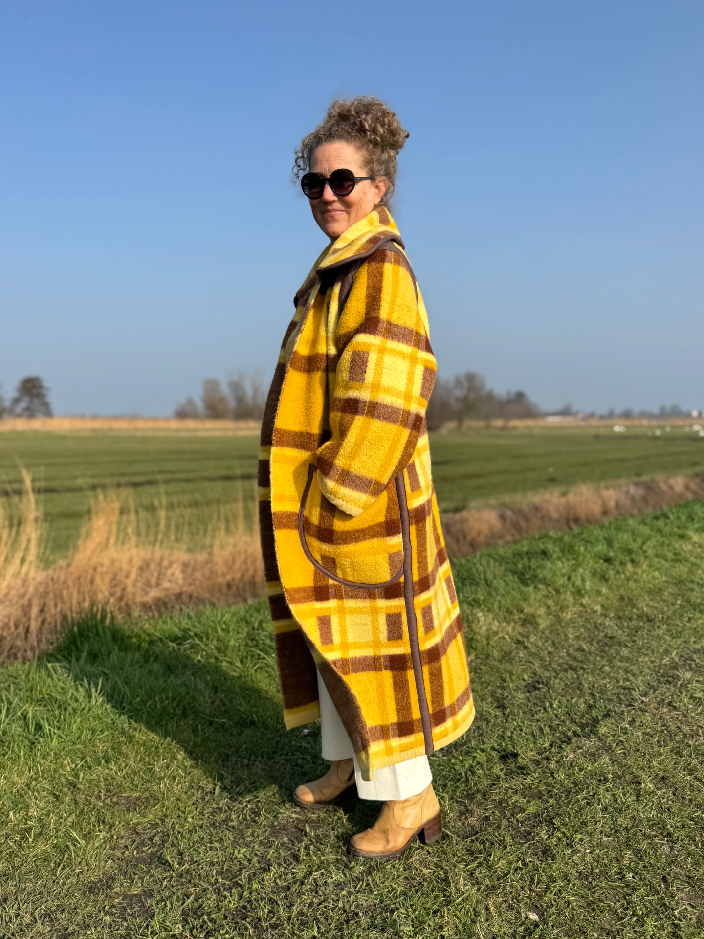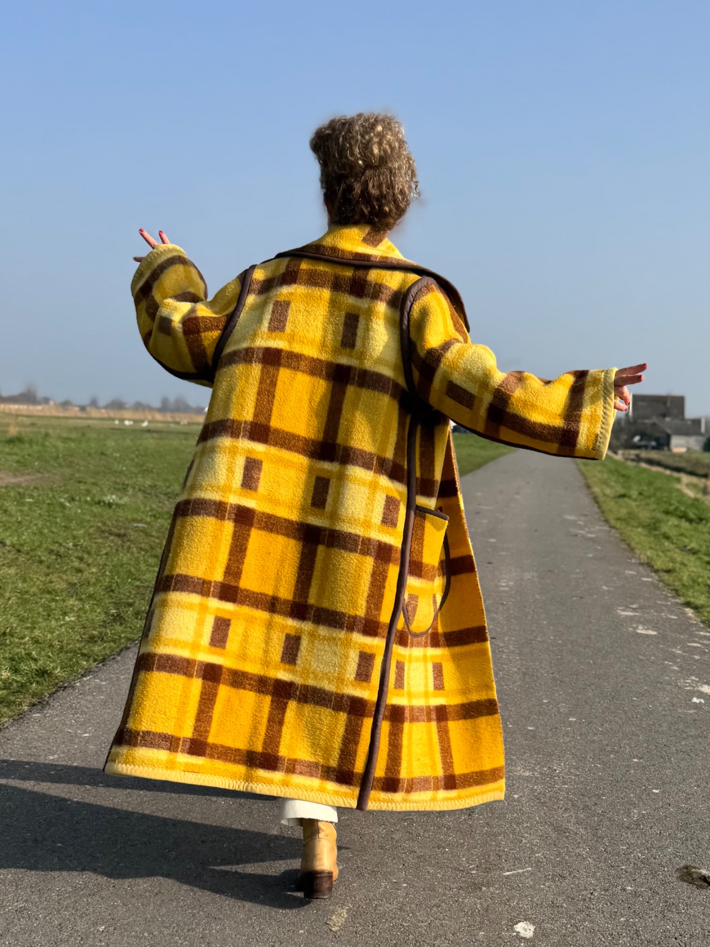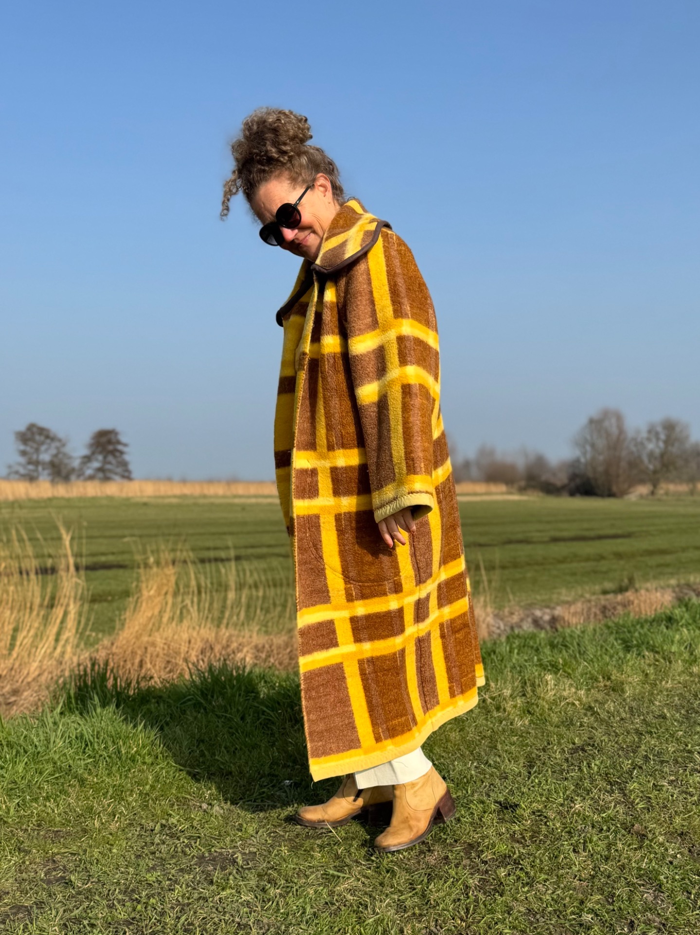 Superleuke kleurencombi, deze geel, mosterd en bruine deken. Grote eigenwijze jaren '70 kraag erop en uniek ben je. Aan de ene kant meer geel, aan de andere meer bruin: net hoe je per staat vandaag. Hij is superzacht en perfect als tussenjas.