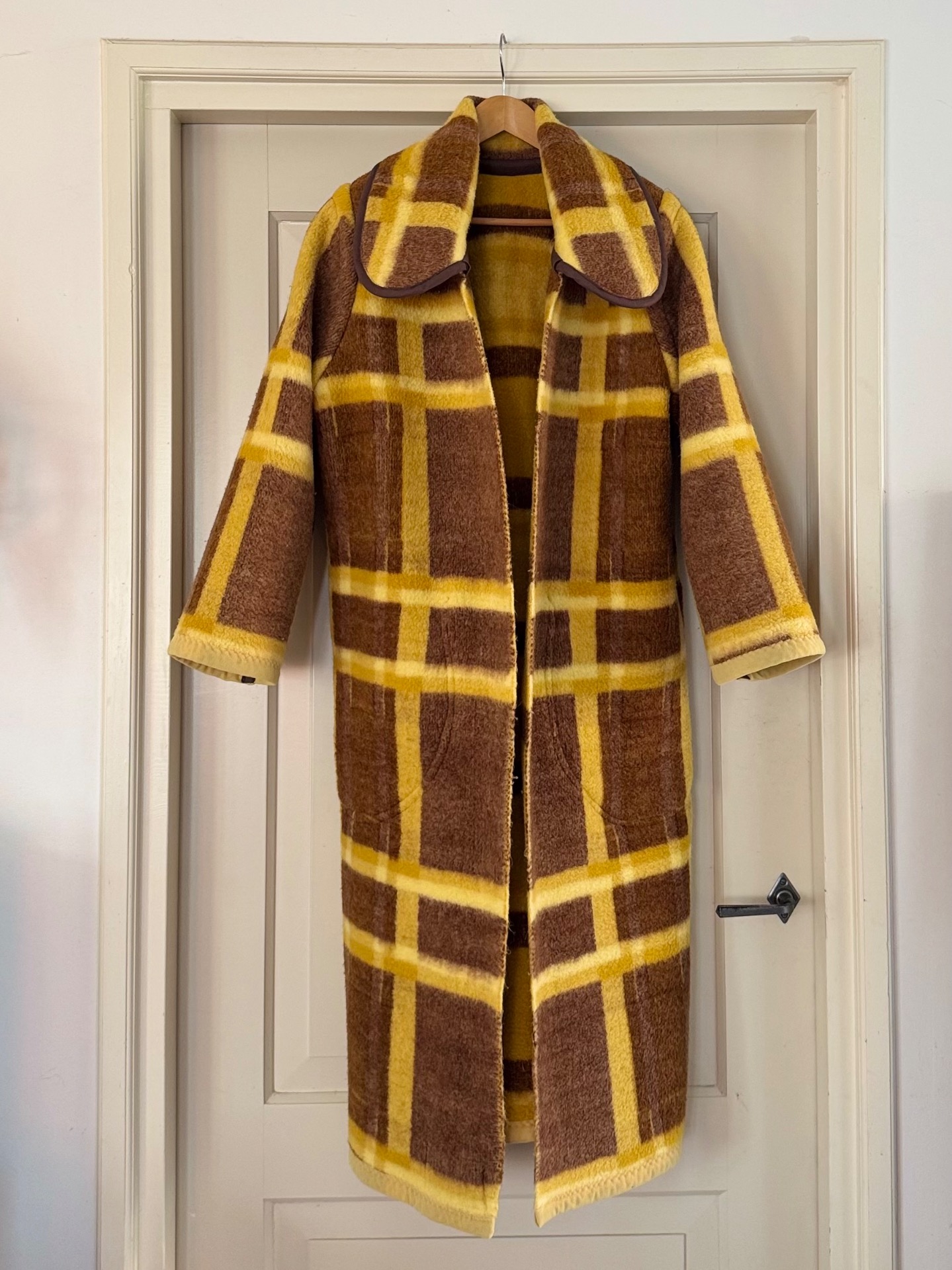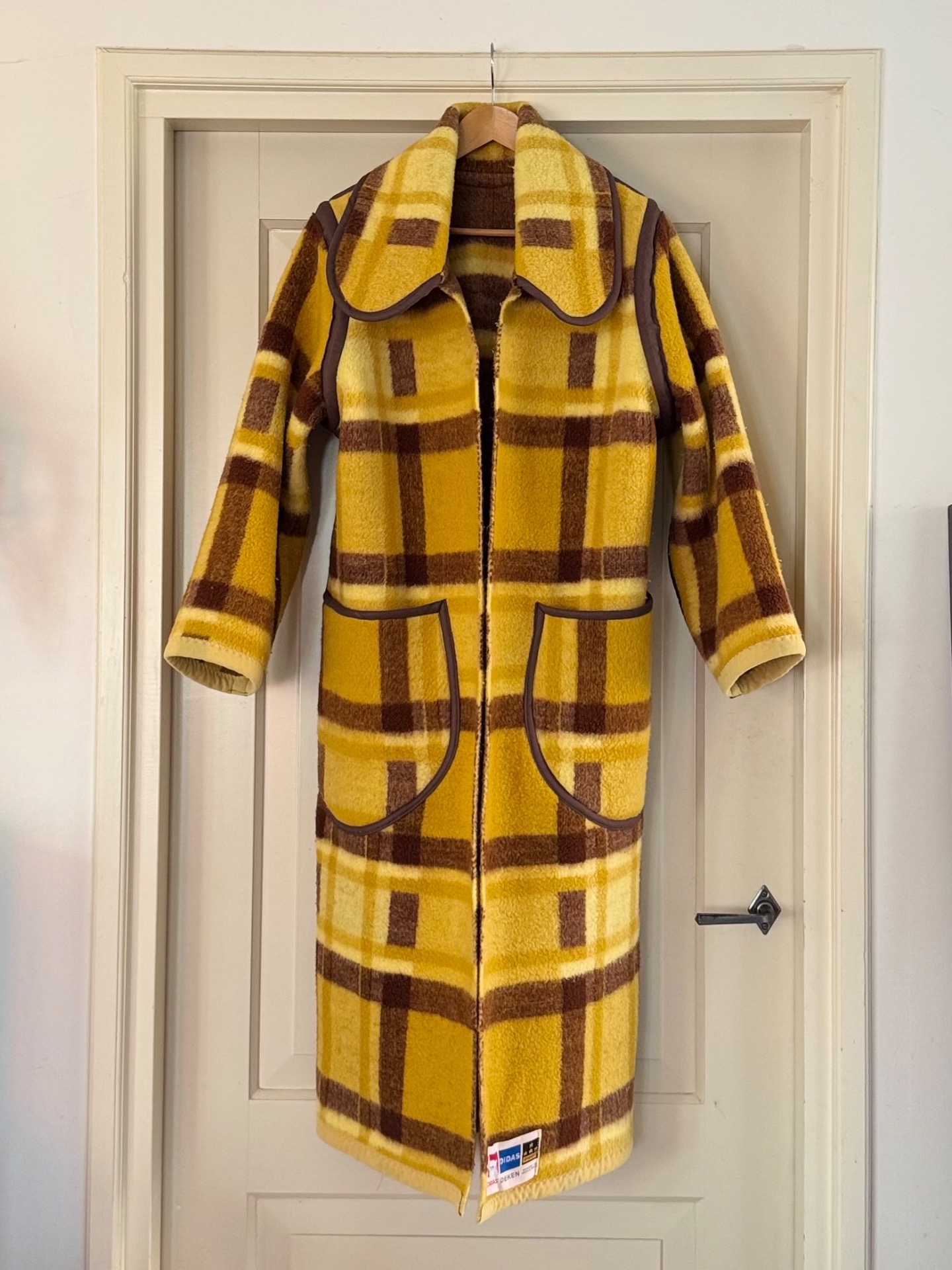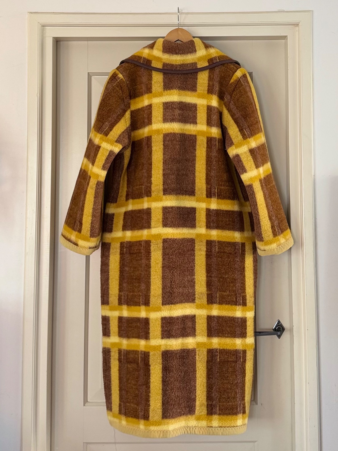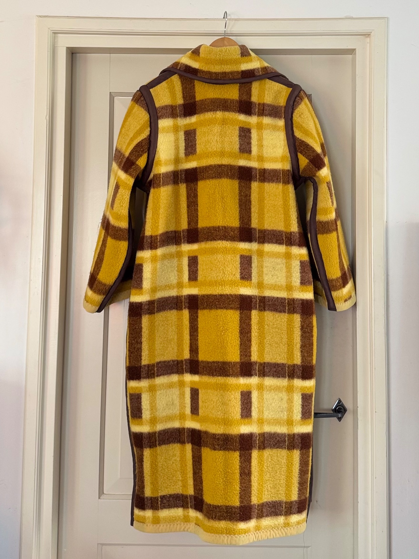 Superleuke kleurencombi, deze geel, mosterd en bruine deken. Grote eigenwijze jaren '70 kraag erop en uniek ben je. Aan de ene kant meer geel, aan de andere meer bruin: net hoe je per staat vandaag. Hij is superzacht en perfect als tussenjas.