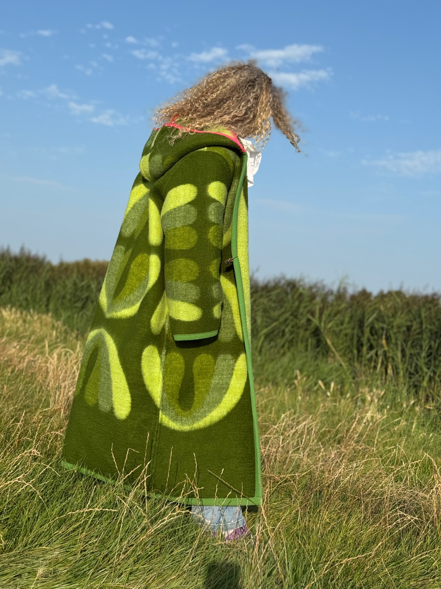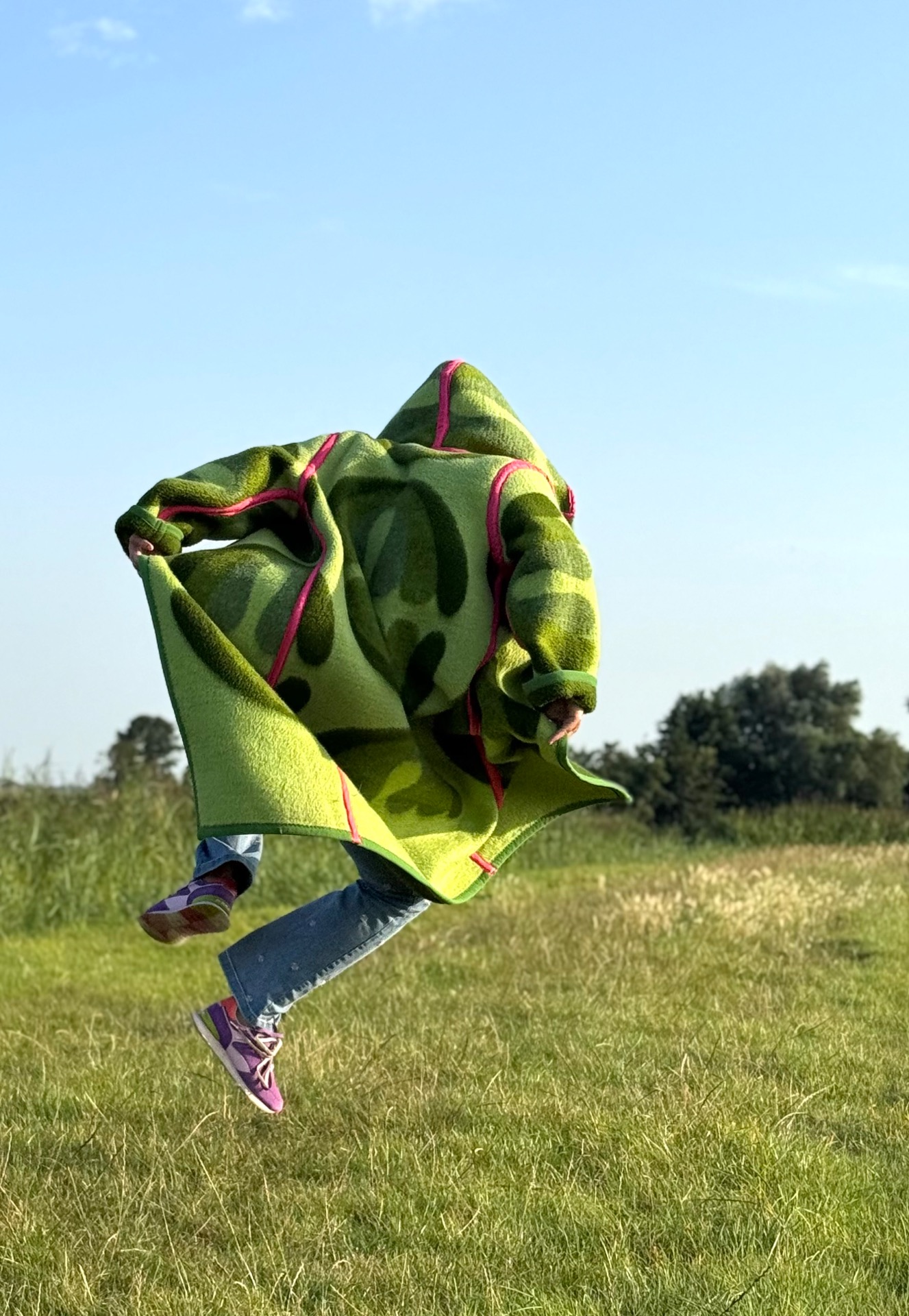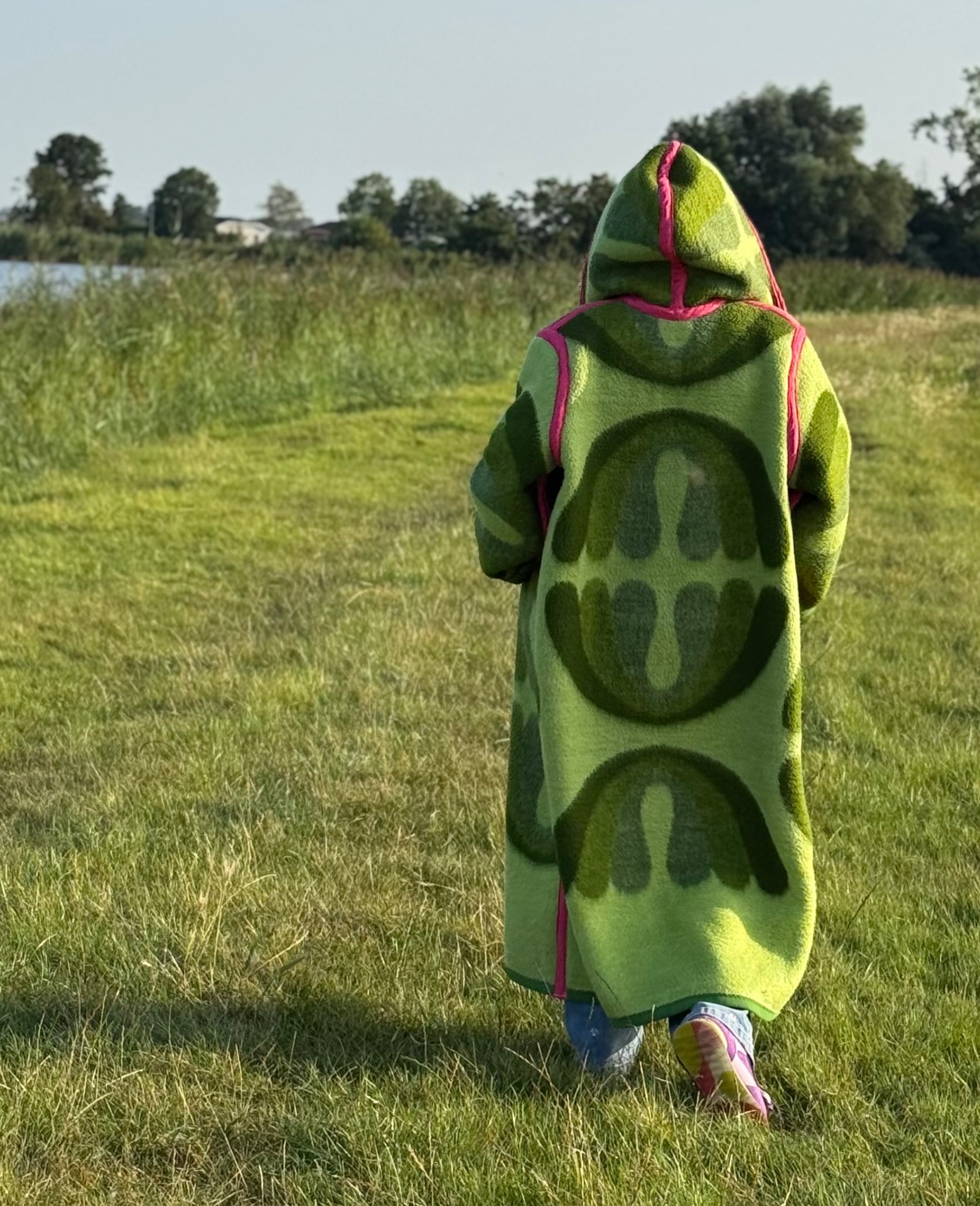 List of ingredients: Made from an original dutch Dralon blanket from the 70's. That means soft, washable, acrylic, relatively light fiber to keep you cozy wherever you go. Blue cotton tape for extra funkiness and a big pin to close the front.